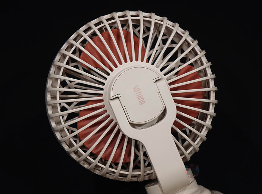 선풍기 부분은 앞서 제품박스에서 언급했듯이 이 제품의 이름에 왜 '썬플라워'라는 명칭이 붙었는지 알 수 있는 그릴 디자인이 가장 먼저 눈에 들어오는데, 바로 꽃 모양에서 모티브를 얻은 디자인을 적용하고 있기때문이죠. 이번에 소싱에서 출시한 대부분의 신제품 휴대용 선풍기들이 이런 그릴 디자인을 적용하고 있습니다. 그리고, 그릴 윗부분에 표시된 시계 반대방향으로 그릴을 돌리면 쉽게 분리도 가능해, 청소도 수월하게 할 수 있죠. 날개는 3엽 날개입니다.