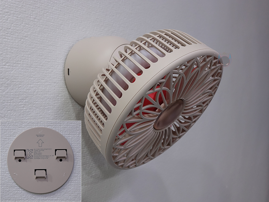 그리고, 선풍기 후면에는 스탠드와 연결되는 목부분이 있는데, 이 목부분은 총 5단계로 60˚ 상하 각도조절을 할 수 있습니다. 그래서, 스탠드, 벽걸이, 타프형 어떤 용도로도 사용할 수 있는거죠. 또한, 각도조절 후에는 좌우 회전도 가능한데, 이 기능은 스탠드에 배치된 버튼에서 바로 확인이 되죠. 스탠드에는 총 3개의 버튼이 적용되어 있는데, 가운데 전원/풍량조절 버튼, 양쪽에 각각 무드등 조절버튼과 좌우회전 버튼입니다. 뒤에서 확인하겠지만, 전원버튼은 이번에 다른 신제품들과 마찬가지로 한 번씩 누를 때마다 전원 On→1단계→2단계→3단계→전원 Off 순으로 작동되며, 무드등은 2단계로 밝기 조절됩니다. 그리고, 스탠드 측면에는 충전케이블과 연결되는 USB Type-C 포트가 적용되어 있으며, 바로 아래에 작동/충전상태를 확인할 수 있는 LED 인디케이터가 적용되어 있습니다.