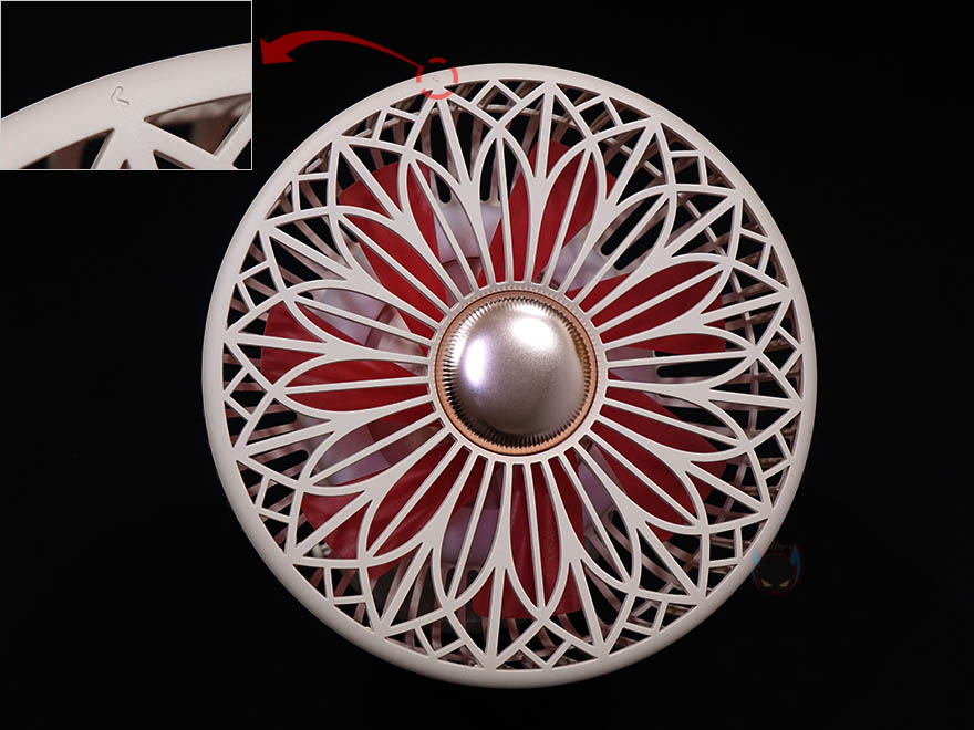 소싱 썬플라워 멀티 선풍기를 본격적으로 살펴보면, 일단 색상은 이번 다른 신제품들과 마찬가지로 2가지 색상으로 출시가 되었는데, 베이지와 그린 색상으로 각각 리치 썬(베이지), 럭키 썬(그린)이라고 명칭하고 있습니다. 제품 이름에 '썬플라워'라고 명칭한 것 처럼 선풍기 전면 그릴부분은 꽃 모양에서 모티브를 얻은 디자인으로 적용되어 있는데, 이번에 신제품으로 함께 출시한 탁상용 선풍기 포레스트 시즌3 모델과 동일한 디자인입니다. 또한, 그릴 맨 윗부분에 표시된 방향 즉, 시계 반대방향으로 돌리면 그릴을 분리할 수 있죠. 그릴을 분리하면 내부에 7엽 날개를 확인할 수 있는데, 이부분도 탁상용 모델과 동일합니다. 그리고, 날개 뒷공간에는 앞서 제품 박스에서 주요 특징 중 하나로 확인한 무드등이 적용되어 있죠.