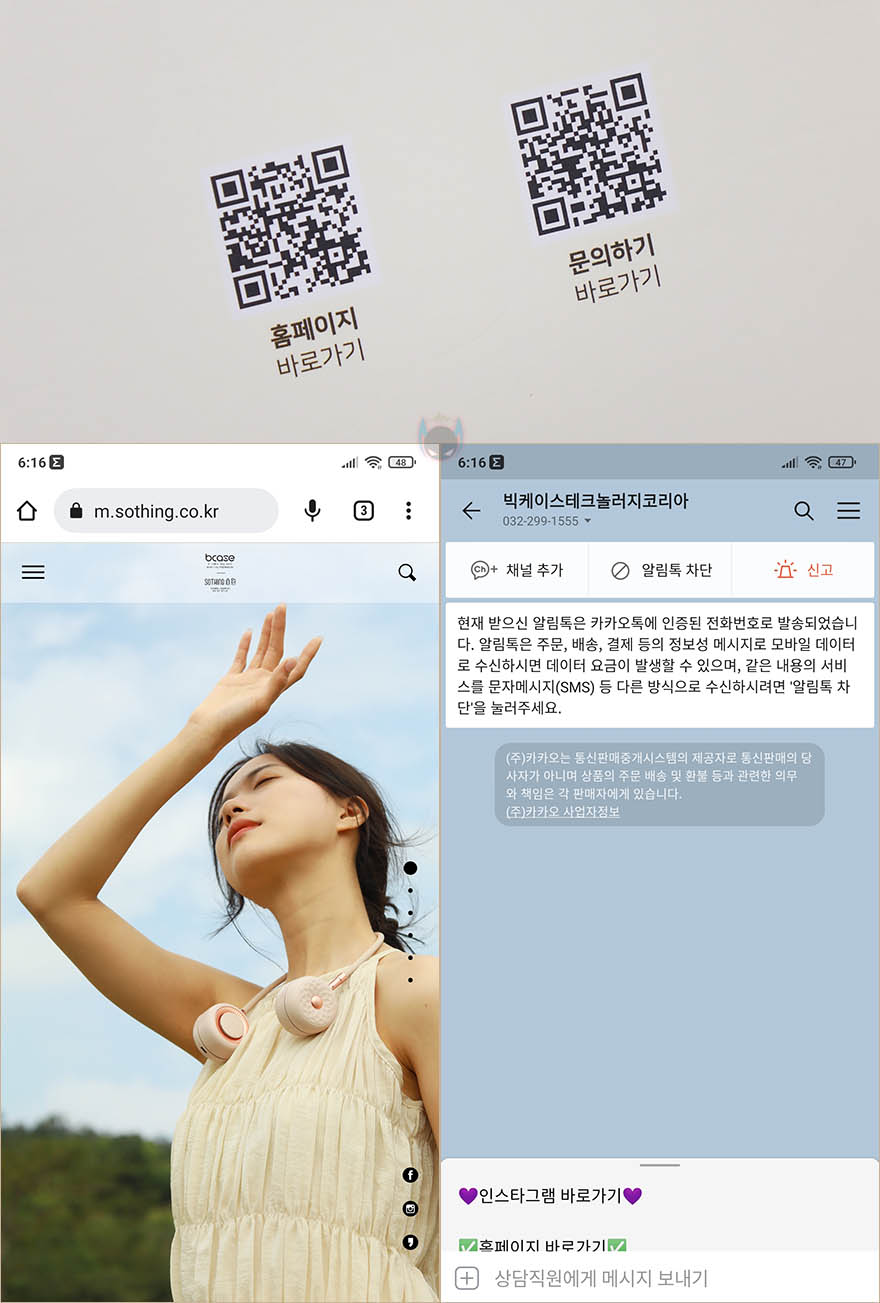 제품박스부터 살펴보면, 전면에는 제품 이름과 함께 제품 디자인 그림을 확인할 수 있는데, 한눈에 봐도 어떤 용도로 사용될 수 있는 선풍기라는걸 짐작할 수 있죠. 그리고, 그 용도는 바로 박스 측면에도 표기를 해놨는데, 벽걸이형, 타프형, 탁상형 3가지 사용법을 제시하고 있습니다. 또한, 바로 아래에는 소싱 정식수입사인 (주)빅케이스테크놀러지코리아 홈페이지로 접속할 수 있는 QR코드와 카카오톡 메신저로 문의할 수 있게 QR코드를 표기해놓고 있는데, 메신저로 연결되면 소싱 공식 SNS 인스타그램(https://www.instagram.com/sothing_official/)으로도 접속할 수 있습니다. 또한, 반대쪽 측면에는 제품의 주요 특징으로 3단 풍량조절, 7엽 날개, 2단계 무드등, 리모컨 원격 조정을 명시하고 있죠.