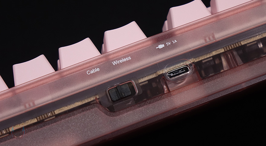 키보드 전면 한쪽에는 유/무선(Cable/Wireless) 스위치, 유선시 사용되는 분리형 케이블과 연결되는 USB Type-C 포트가 배치되어 있으며, 키보드 측면에서 보면 타이핑에 최적화라 불리우는 스텝-스컬처2(step sculpture 2) 단계배열을 확인할 수 있으며, 키보드 밑바닥 앞부분에는 2단 높낮이조절 받침대가 적용되어 있습니다. 끝으로, 유선시 사용되는 분리형 케이블은 USB Type-C to A 인터페이스를 가졌습니다.