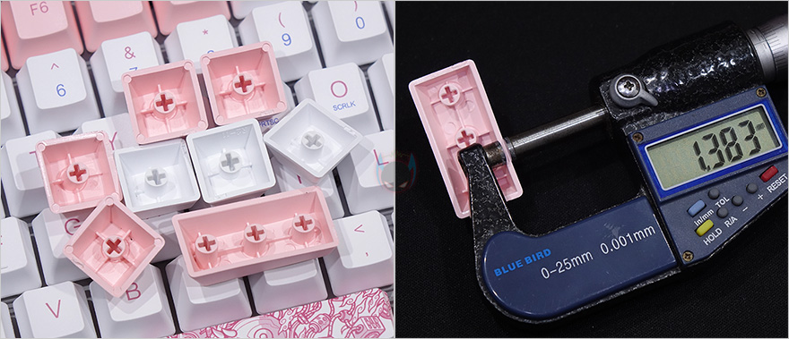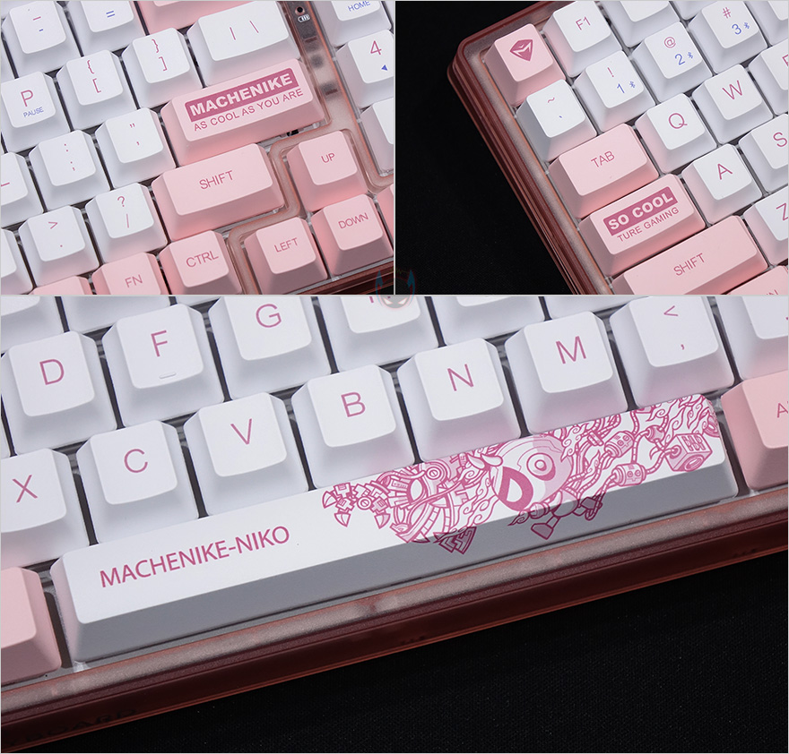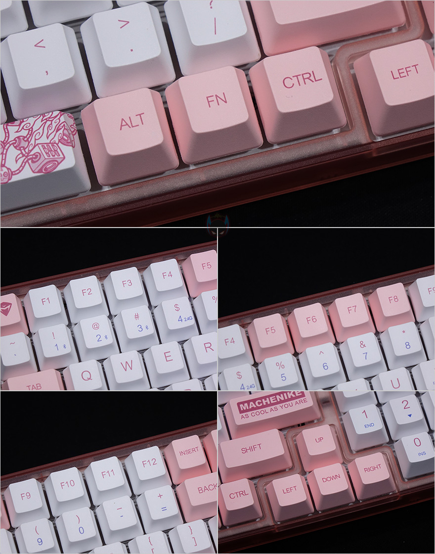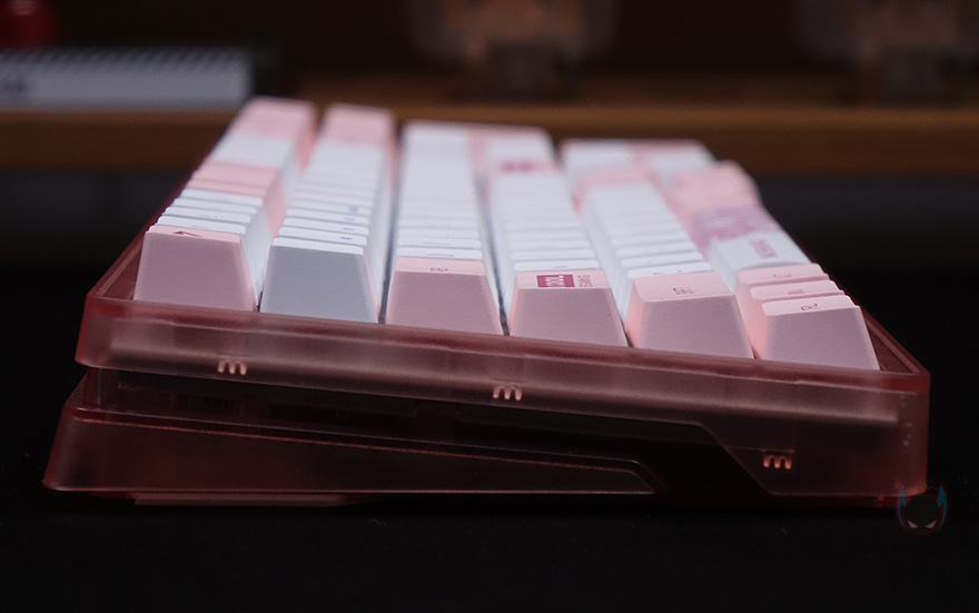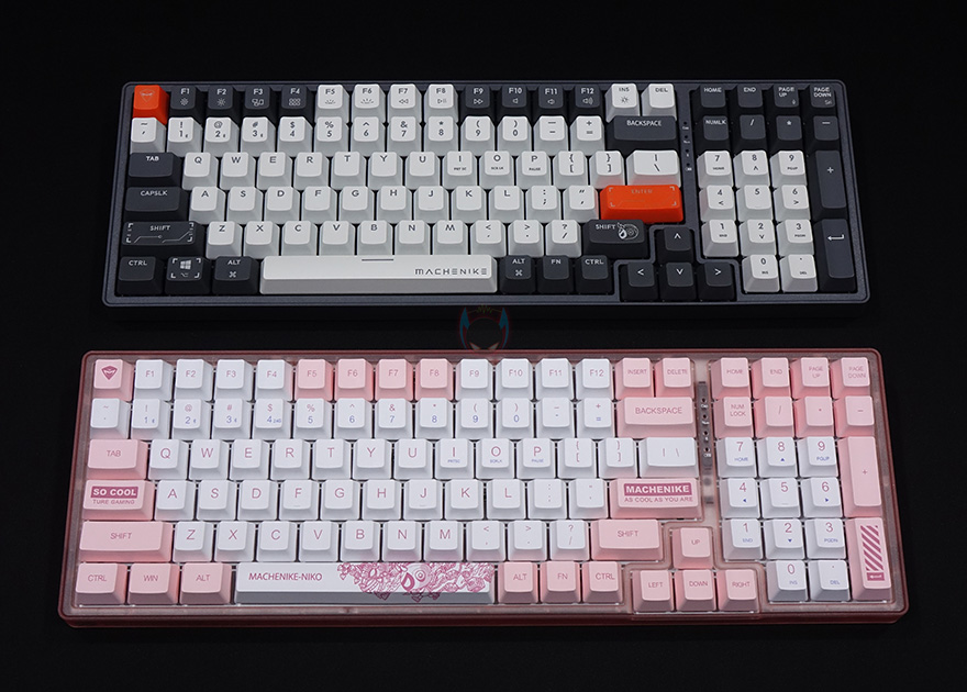 1세대와 동일한 98키 배열을 가졌기 때문에, Capslock과 Numlock, 무선 연결, 배터리 표기상태를 보여주는 LED 인디케이터도 숫자 키패드와 엔터 키 사이에 배치되어 있습니다. 그리고, 키-캡에서도 클리어 컬러 색상에 맞춰서 투-톤 컬러로 적용하고 있는데, 에코(Echo) 같은경우에는 핑크&화이트(Pink&White) 색상으로 적용하고 있으며, 일부 키-캡에는 포인트로 로고나 캐릭터 디자인도 새겨놨습니다.