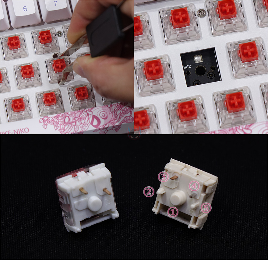 키-캡은 1세대와 마찬가지로 PBT재질이며, 두께는 약 1.4mm에 가까운 두께를 가졌고, 스위치는 1세대와 달리 2세대에선 카일 BOX(Kailh Box) 스위치를 적용했습니다. 참고로, 스위치는 2가지로 적축(Red switch)과 백축(White switch)으로 적용되었으며, 앞서 구성품에서 언급했듯이 K600 2세대(Gen2) 모델에선 스위치로 분리가 가능한 핫-스왑(Hot-swap) 방식을 적용하고 있습니다. 그래서, 실제로 제공되는 스위치 리무버로 분리해보면, 내부 PCB기판에 SMD LED가 박힌 것을 확인할 수 있으며, 스위치는 3pin과 5pin 모두 장착할 수 있게 구멍처리가 되어 있습니다. 이렇게 스위치를 교체할 수 있다라는 점은 소비자에게 자기 취향으로 바꿀 수 있어서 매우 매력적인 부분이라 할 수 있죠. 그리고, 스페이스-바 같은 스테빌라이저는 체리식으로 적용되어 있습니다.