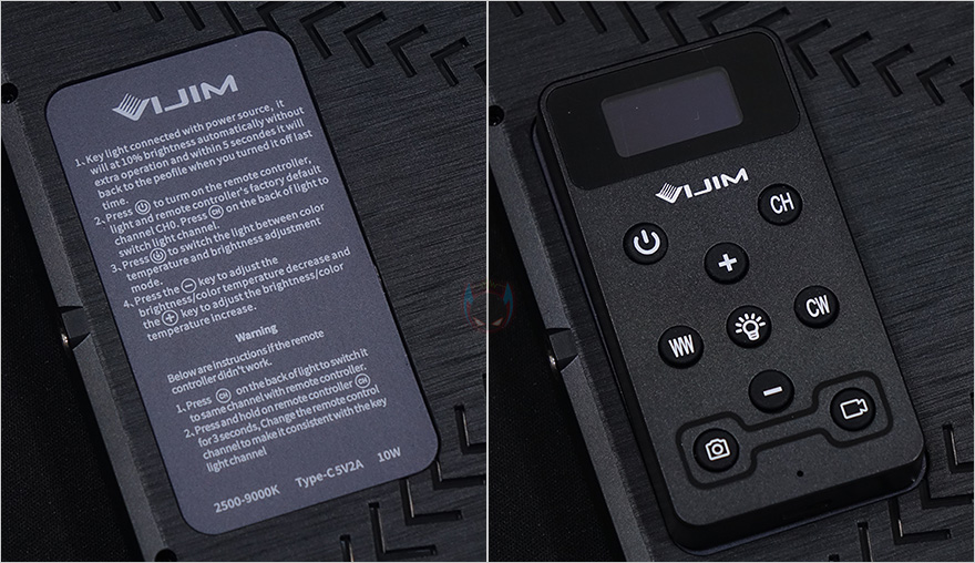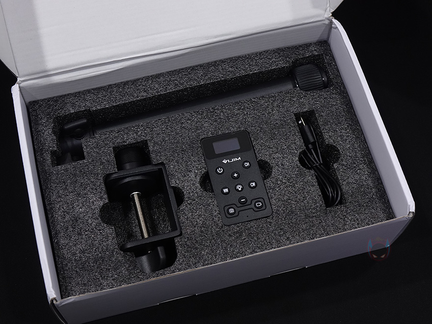 제공해주는 무선 리모컨에는 OLED 디스플레이가 적용되어 있으며, 기능들은 본체 후면에 배치된 기능들을 모두 담고 있으며, 오히려 사용법도 더 편리합니다. 그리고, 카메라/캠코더나 스마트폰에 블루투스 기능이 있다면, 사진/동영상 시작/종료버튼 기능도 함께 연동해서 사용할 수 있게 맨 아래 버튼에 배치되어 있죠. 리모컨 후면에 보면 자세한 설명법이 표기되어 있습니다. 간단히 설명하자면, 전원버튼은 3초이상 누르면 리모컨을 Off 할 수 있고, CH는 채널버튼, WW/CW는 색온도, +/-는 밝기조절, 가운데 전구표시는 조명 On/Off입니다. 카메라/캠코더/스마트폰의 사진/동영상 시작/종료 버튼 사용법은 뒤에서 언급하겠습니다. 또한, 함께 제공해주는 분리형 USB 전원케이블은 1.5m 길이에 USB Type-C to A 인터페이스를 가졌으며, 마지막으로 역시 함께 제공해주는 확장 볼헤드 폴대는 3단 길이조절로 최대 74cm까지 확장되며, 클램프와 결합해서 사용하면 됩니다.