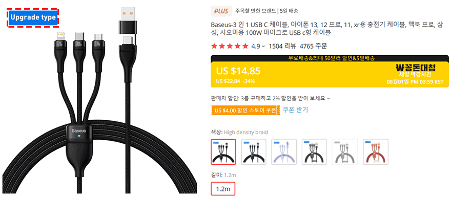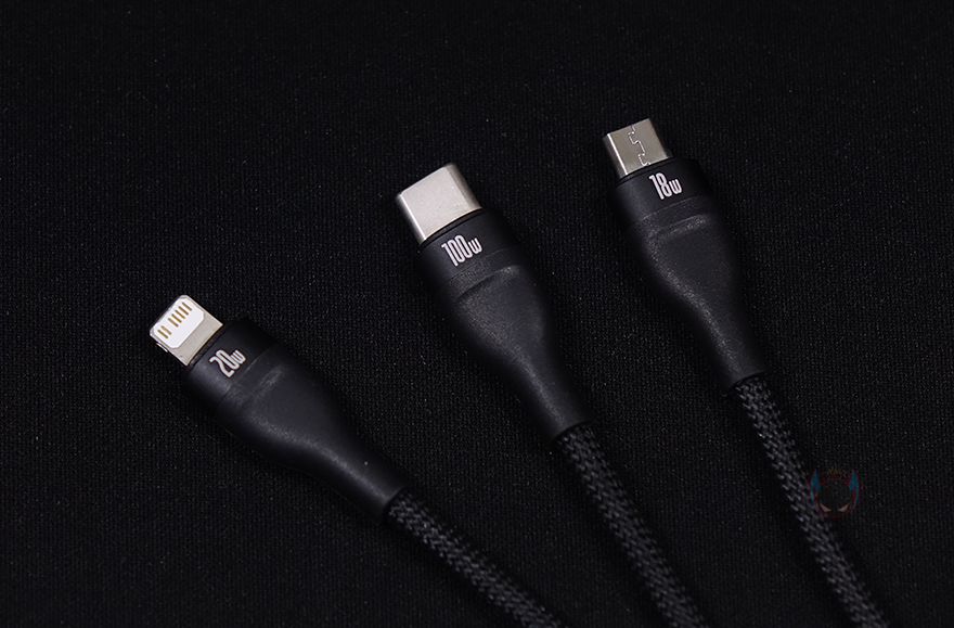 그럼, 본격적으로 베이스어스(Baseus) 3-in-1 충전케이블 살펴보면, 케이블 길이는 총 1,3m이며, 슬리빙처리된 부분의 길이는 약 1.2m입니다. 그리고, 현재 이 3-in-1 충전케이블은 기본버전과 업그레이드버전 2가지로 판매되고 있는데, 기능적인 부분 그러니깐 3가지 인터페이스와 최대 100W 지원은 모두 동일하게 슬리빙부분에서 밀도의 차이를 두고 있으니 구입전 참고하면 될 것 같습니다. 3가지 인터페이스부분의 케이블 길이는 약 30cm이며, 인터페이스는 각각 라이트닝, USB Type-C, 마이크로 5핀입니다. 그리고, 각 인터페이스에는 최대 고속충전 표기를 해놔서 이용자가 쉽게 파악할 수 있으며, 최대 100W 지원은 USB Type-C 죠. 물론, 나머지 인터페이스도 표시된 충전속도가 해당 규격에서 최대 고속충전입니다.