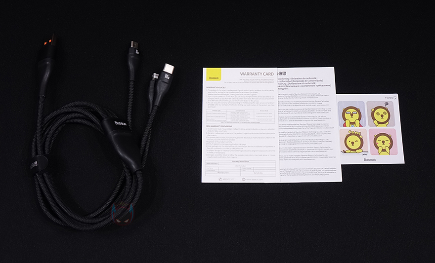 제품박스부터 살펴보면, 전면에 제품 이미지를 통해 바로 이 제품의 케이블 형태가 어떤 것이 알 수 있습니다. 시작에서 언급했듯이 3-in-1 방식으로 총 3개의 USB 인터페이스 충전 연결방식을 갖추고 있죠. 그리고, 박스 측면에는 제품의 주요 특징을 표기해놨는데, 최대 100W 고속충전, 2가지 입력방식과 3가지 출력방식, 고속충전 장치 인식 칩 탑재 입니다. 또한, 박스 후면에는 한국어를 포함해 각 나라별로 제품의 기본사양을 표기해놨죠. 박스를 열어보면, 포장은 흔들리지 않게 틀-방식에 끼운 별도의 포장재를 사용하고 있으며, 제품구성은 3-in-1 충전케이블, 보증서, 스티커 구성으로 간단합니다.