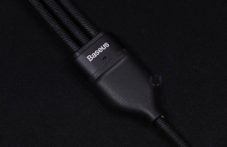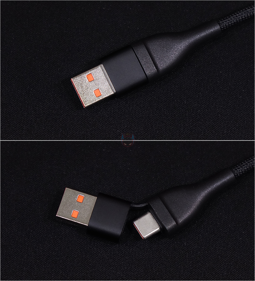 그리고, 3가지 인터페이스가 나뉘어지는 중간 분배지점에는 앞서 제품박스에서 확인했듯이, 고속충전을 지원하는 외부장치가 연결되었을 때, 고속충전 지원 제품임을 인식하는 칩이 내부에 적용되어 있으며, 로고(Logo) 바로 아래에는 작동상태를 확인할 수 있는 LED 인디케이터도 적용되어 있습니다. 또한, 충전어댑터와 연결되는 입력단자 USB 인터페이스도 USB Type-A와 Type-C 2가지를 젠더 방식으로 갖추고 있죠. 쉽게말해 100W 고속충전 어댑터를 사용할때는 USB Type-C로 어댑터와 연결하면 됩니다.