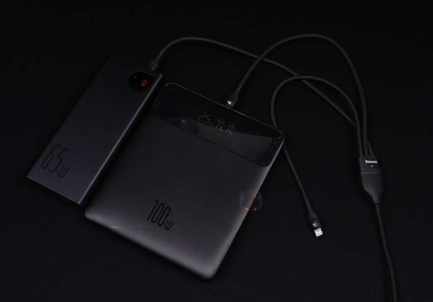 직접 베이스어스(Baseus) 3-in-1 충전케이블을 사용해보면, 앞서 언급했듯이 USB Type-C 인터페이스는 최대 100W까지 고속충전을 지원합니다. 물론, 이를 제대로 사용하기위해서는 충전어댑터 역시 100W를 지원해야하죠. 실제로 100W 고속충전어댑터에 연결해서 최대 65W 충전을 지원하는 보조배터리를 연결해보면, 근접한 충전속도를 확인할 수 있어서, 노트북이나 스마트폰 같은 고속충전제품들을 사용하기에 유용하다할 수 있습니다. 그리고, 충전이 시작되면, 중간 분배장치에 LED 인디케이터도 블루색상으로 점등이 되죠. 참고로, 다른 올인원 케이블과 마찬가지로 이 제품 역시 2개이상의 장치를 연결하게 되면 USB Type-C 같은경우 최대 고속충전이 작동하지 않습니다. 물론, 마이크 5핀이나 라이트닝 속도는 최대로 작동하죠.