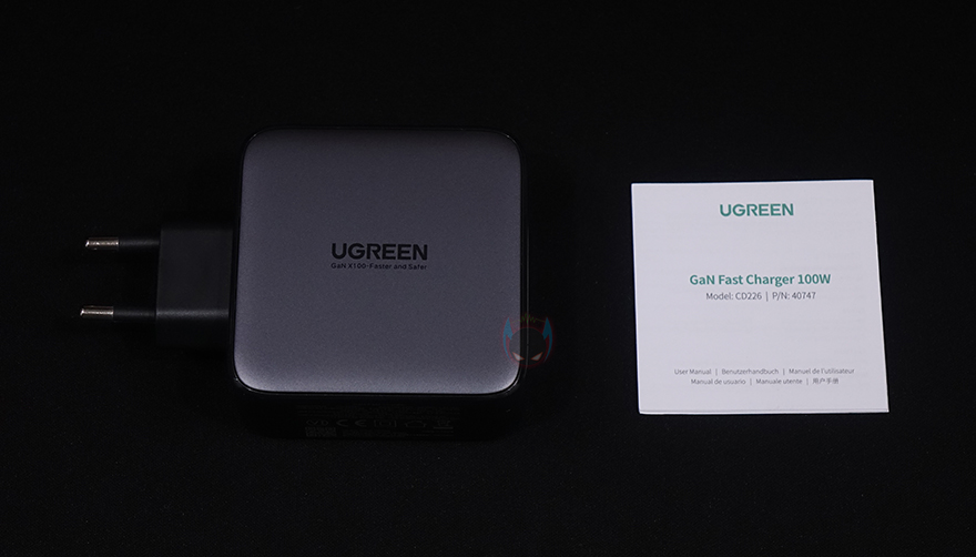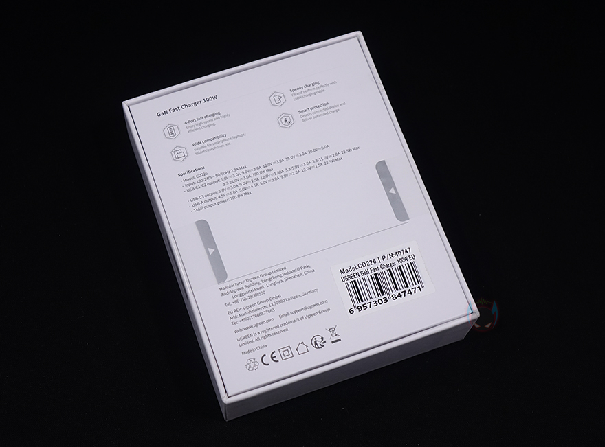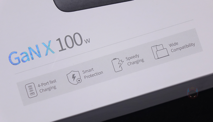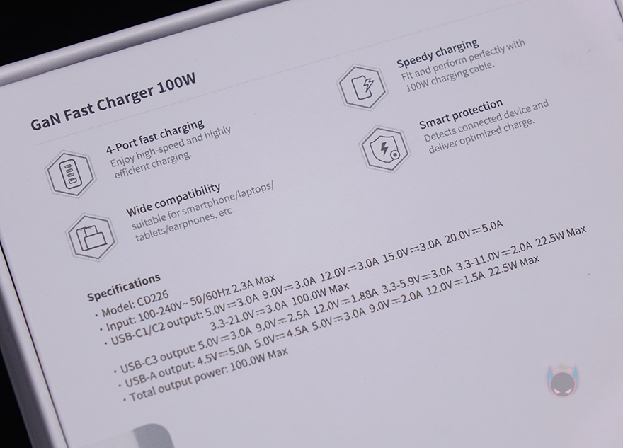 제품팩키지는 박스형태로 전면에 모델명과 함께 제품 이미지를 담고 있어서, 개봉전에 미리 디자인을 확인할 수 있습니다. 그리고, GaN 방식의 100W 충전 표기와 함께 4개의 포트, 스마트보호장치, 고속충전, 폭넓은 호환성을 이 제품의 주요 특징으로 표기해놨죠. 박스 후면에는 같은 내용의 표기와 함께 아래에 제품의 기본 사양표기를 추가로 확인할 수 있는데, 각 포트별로 전압과 최대 전력 출력을 확인할 수 있습니다. 그리고, 박스를 열어보면 충전기는 기본 비닐포장으로 처리되어 있으며, 제품구성은 간단하게 충전기와 설명서로만 이루어져 있죠.