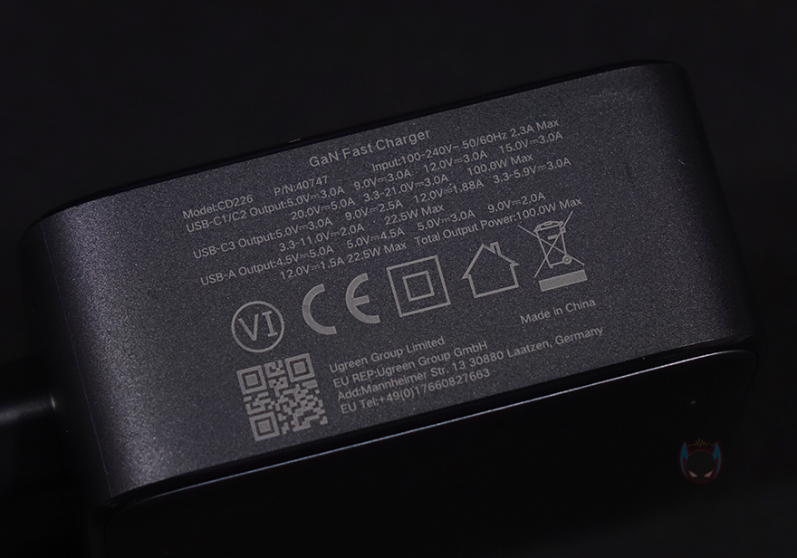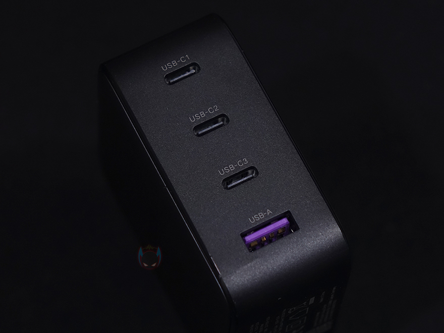 충전기 전면에는 USB 포트 4개를 갖추고 있는데, USB Type-C 포트 3개, Type-A 포트 1개입니다. 그리고, 충전기 아랫부분에는 앞서 제품박스에서 확인했던 기본 사양표기를 다시 확인할 수 있는데, 방금 확인한 USB Type-C 포트 중 1번과 2번은 최대 100W 충전속도를 지원하며, 3번 포트는 최대 22.5W, 마지막으로 Type-A 포트도 최대 22.5W의 충전속도를 지원합니다. 충전기에 모두 표기가 되어 있기때문에 사용전에 한 번 참고하면 좋겠죠. 또한, 4개의 포트 모두 최소 충전속도는 15W이기때문에, 이보다 낮은 충전속도의 전자 제품을 연결할시에는 전자 제품의 고장 발생이 될 수 있음으로 참고해야합니다. 물론, 이건 모든 충전기 제품들을 사용할 때 꼭 알아두어야하는 부분이죠.