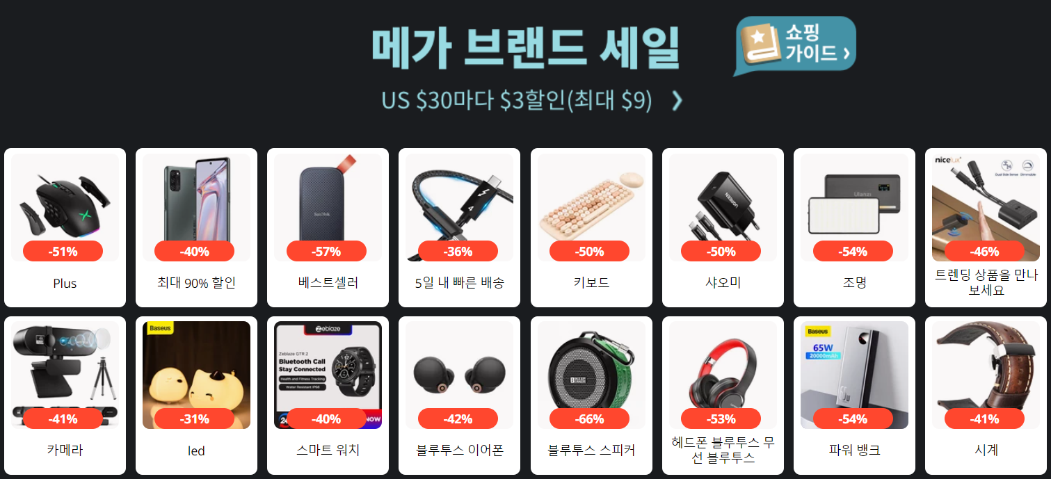 한국시간으로 오늘 8월 22일 오후 4시부터 알리익스프레스에서 8월 할인행사인 '메가 브랜드 세일'을 시작한다(8월 27일 마감). 이번 메가 브랜드 세일은 알리익스프레스에서 소비자들에게 인기있는 브랜드를 최대 90%까지 할인하는 행사로 구입상품이 $30씩 넘을때마다 최대 $9달러 할인은 해주고, 결제시 카카오페이, 네이버페이, KB국민카드, NH농협카드, 우리카드, JCB카드 사용시 추가 할인도 해주고 있다. 물론, 결제 할인혜택은 선착순.