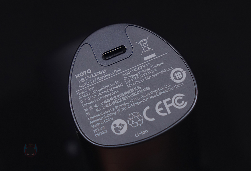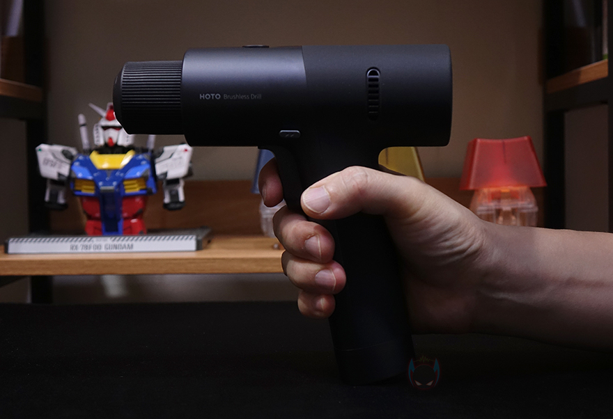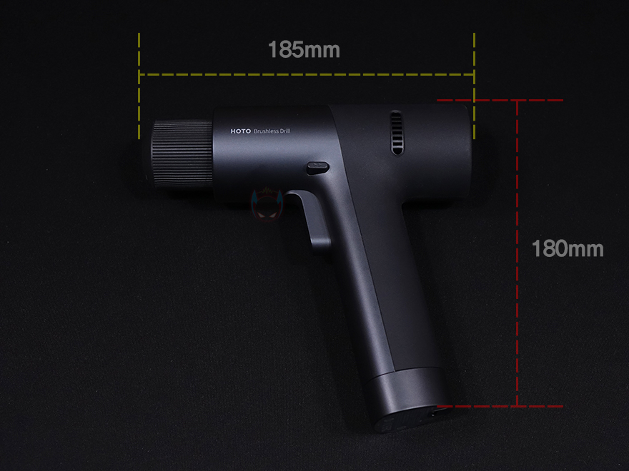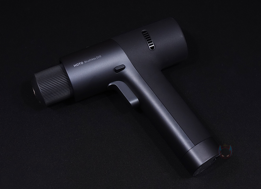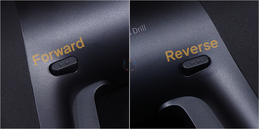 부위별로 좀 더 자세히 살펴보면, 일단 메탈그레이 색상부분은 실제 메탈(Metal) 소재가 사용되었으며, 측면에 'HOTO Brushless Drill'라고 표기를 해놨죠. 참고로, 손잡이부분과 후면 검은색부분은 TPU 고무 코팅으로 처리해 부드러운 질감을 줍니다. 그리고, 모두 무광택으로 처리해서 고급스러운 느낌도 주죠. 손잡이부분에는 사용작동 역할을 하는 트리거(Trigger)가 적용되어 있으며, 다른 드릴 제품들처럼 트리거 윗부분에는 앞/잠금/뒤(Forward/Lock/Reverse) 스위치 버튼이 적용되어 있습니다. 또한, 스위치는 방향표시를 통해 쉽게 앞/뒤 구분을 할 수 있는데, 잡고 있는 상태에서 스위치가 중간에 위치하면 트리거가 작동하지 않으며, 왼쪽으로 스위치를 옮기면 앞으로 그러니깐 드릴이나 드라이버를 사용했을 시 뚫거나 나사를 체결하는 방향으로 작동하고, 오른쪽으로 스위치를 옮기면 반대로 빼거나 푸는 작동을 합니다.