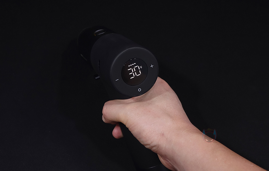 그리고, 손잡이 뒷쪽으로 양쪽 측면에는 사용시 내부 모터로 인해 생기는 발열을 배출하기위해 에어홀처리가 적용되어 있으며, 후면에는 뒤에서 확인하겠지만, 작동상태 및 기능 설정을 다룰 수 있는 버튼과 LED 스크린(Screen)이 적용되어 있습니다. 또한, 손잡이 밑바닥부분에는 제공되는 USB 충전케이블과 연결되는 USB Type-C 포트가 적용되어 있는데, 최대 15W 충전속도를 지원하며, 내부에는 2,000mAh 배터리가 내장되어 있습니다.