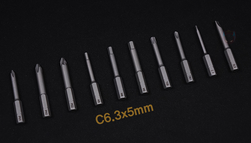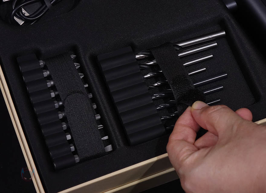 끝으로, 기본제공되는 비트(Bits)들을 살펴보면, 일단 드라이버(Driver) 비트는 총 10개로 C6.3 규격의 5mm 길이를 가졌으며, 십자, 육각, 삼각, 일자 등 다양한 모양으로 제공됩니다. 그리고, 드릴(Drill) 비트 같은경우에는 총 8개가 제공되는데, 4개는 나무(Wood)를 뚫을 때 사용되는 목공용이며, 나머지 검은색(Black) 4개의 비트는 철(Metal) 같은 소재를 뚫을 때 사용됩니다. 굵기와 길이가 다양해서 사용 소재에 따라서 맞춤으로 사용하면 되겠습니다. 그리고, USB 충전케이블은 총 50cm길이를 가졌으며, Type-C to A 인터페이스를 갖추고 있습니다.