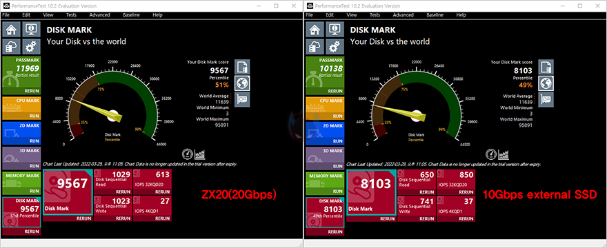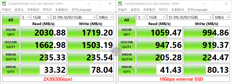 추가로 벤치마크 프로그램들을 통해 ZX20과 10 Gbps 외장 SSD의 성능을 비교해보면, 모두 ZX20이 20Gbps 지원 제품답게 월등히 앞서는 것을 확인할 수 있습니다. 속도로 측정되는 프로그램에선 거의 2배 가까운 성능차이를 보여주고, 점수로 측정되는 프로그램에서도 앞서는 것을 확인할 수 있죠. 그리고, 실제로 10GB 파일(File)을 전송할 때 속도 비교를 해보면, ZX20은 1GB/s 속도(Speed)를, 10Gbps 외장 SSD는 670MB/s대의 속도로 ZX20 외장 SSD가 더 빨리 전송되는 것을 확인할 수 있습니다.