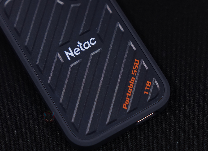 좀 더 자세히 살펴보면, 색상은 옅은 청록색(Pale bluish green)이며 케이스 상판부분은 플라스틱 재질로 빗살무늬의 홈-처리 디자인과 함께 가운데 Netac 로고(Logo)를 새겨놨으며, 아랫부분에 외장 SSD와 용량 표기를 확인할 수 있습니다. 참고로, ZX20은 512GB와 1TB 2가지 용량으로 출시되었습니다. 그리고, 오른쪽 윗부분에는 휴대 시 가방 같은 곳에 걸 수 있게 고리 디자인도 적용되어 있죠. 그리고, 측면 아랫부분에는 USB Type-C 포트가 적용되어 있는데, 앞서 여러 번 확인했듯이 USB 3.2 Gen2x2 방식까지 지원합니다. 그리고, 테두리와 후면 전체는 외부 충격방지 및 미끄럼 방지를 위해 고무 코팅(rubber coating) 소재를 적용했습니다.