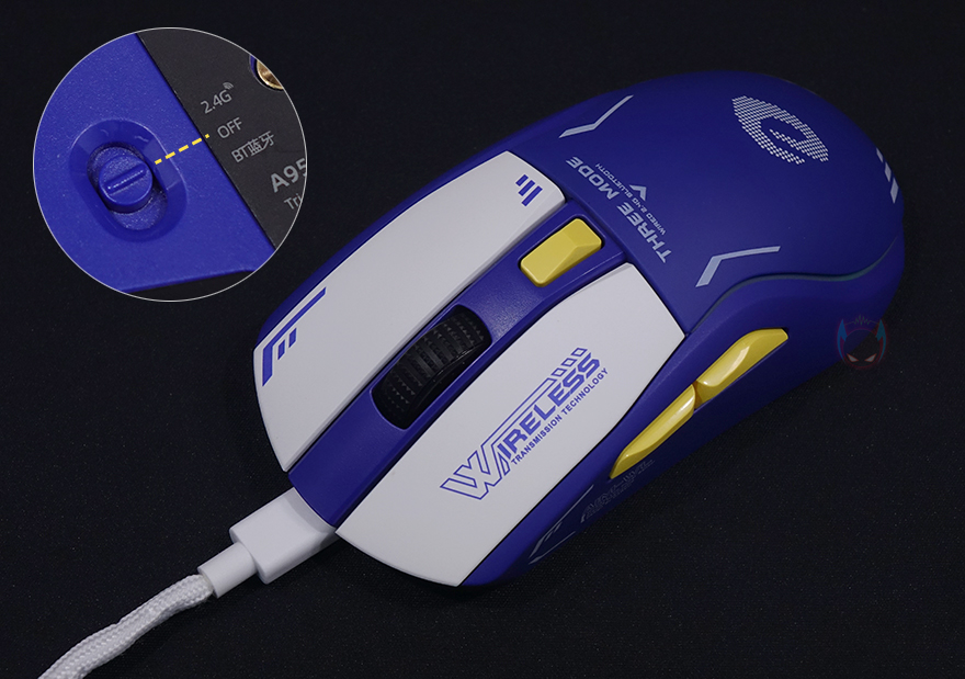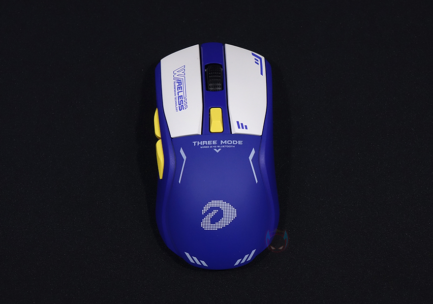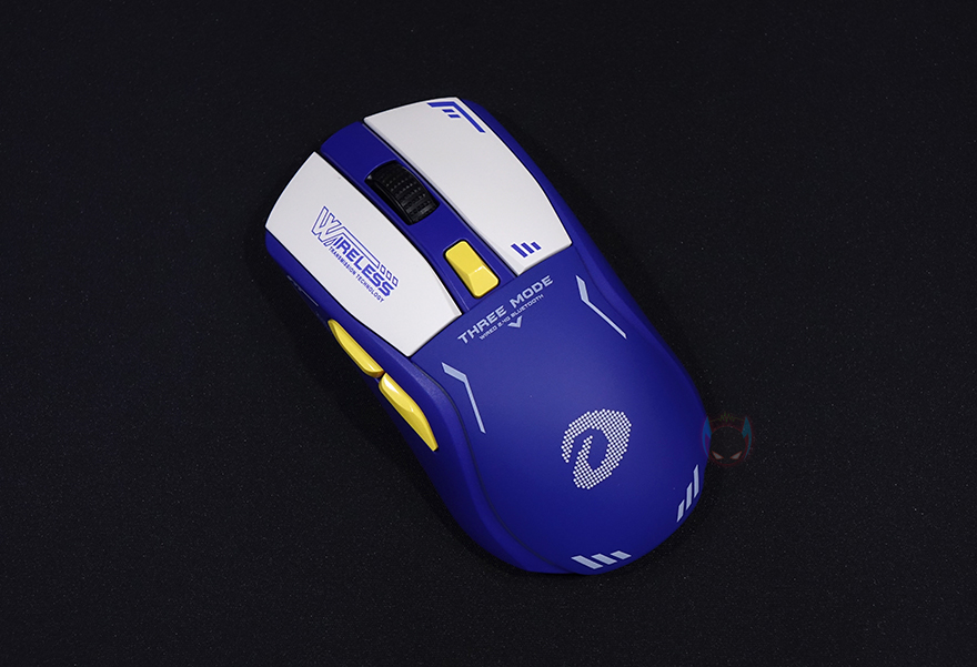 다시 마우스로 돌아와서 A950 마우스를 좀 더 자세히 살펴보면, 한눈에 봐도 디자인이 인상적이라는 걸 느낄 수 있죠. 단순히 색상만 적용한 게 아닌 문구와 포인트 같은 디자인을 적용하고 있습니다. 보통 이런 디자인은 커스텀 마이징 성격으로 한정판 같은 제품에서 볼 수 있다 할 수 있는데, 다얼유 A+ 라인업인 만큼 상당히 신경을 쓴 모습입니다. 그리고, 좌우대칭형에 무선 2.4 GHz 동글이 수납된 상태의 무게는 약 89g으로 무선 마우스치고는 가벼운 편에 속하죠.