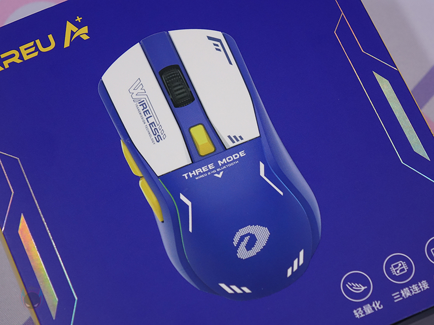 제품 패키지를 살펴보기 전에, 필자의 경우 리뷰 샘플이 중국 내수용이라 국내 출시된 박스 패키지 디자인과는 차이가 있습니다. 제품 박스 전면에는 제품 이미지와 함께 DAREU A+ 표기와 모델명을 확인할 수 있는데, 시작에서도 언급했듯이 A+ 시리즈는 다얼유의 고급형 라인업입니다. 국내에는 이번 A950 마우스뿐만 아니라 앞전에 가스켓 하우징의 A98 및 A87 Pro 키보드가 먼저 출시되었는데, 이들 역시 A+ 라인업이죠. 전면에는 추가로 주요 특징에 초경량, 3가지 연결방식, 충전에 대한 표기를 해놨으며, 박스 한쪽 측면에는 이 제품이 대표적인 특징 중 하나인 전용 충전독과 무선 2.4GHz, 그리고 RGB 조명에 대한 표기를 추가로 확인할 수 있습니다.