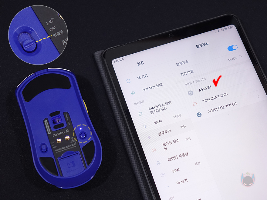 마우스 연결 같은경우에는 앞서 언급한 대로 유선 1가지, 무선 2가지(2.4 GHz, 블루투스) 총 3가지 연결방식으로 사용자가 환경에 따라 선택할 수 있는데, 유선으로 사용할 때는 스위치 위치와 상관없이 USB 전원 케이블을 마우스에 연결하면 바로 사용할 수 있는데, 이왕이면 충돌 방지를 위해 기본 Off에 두는 것을 권장하며, 동글이를 사용한 무선 2.4 GHz 연결은 스위치를 옆에 표시된 2.4 GHz 위치에 두고 동글이를 컴퓨터 본체 또는 전용 충전독에 꽂아서 동글이 인식이 되면 자동으로 무선 연결이 됩니다. 마지막으로 블루투스 연결은 스위치를 맨 아래 두고, 오른쪽에 배치된 페어링 버튼을 누른 후 페어링 모드가 시작되면, 연결할 기기에서 검색을 통해 'A950 BT'가 검색되면 선택해서 연결하면 됩니다. 연결방식들은 이미 시장에 나와있는 제품들과 큰 차이가 없기 때문에 어렵지 않습니다.
