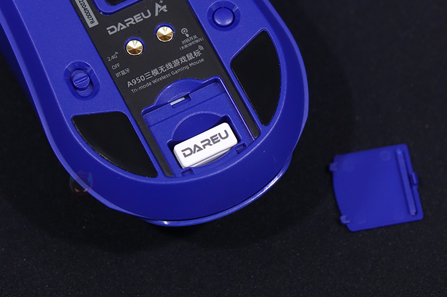 마우스 밑바닥부분에는 총 5곳에 피트가 부착되어 있는데, 모두 개봉 시에는 보호필름이 부착되어 있으며, 가운데 센서 배치와 함께 아래에는 전용 충전독과 연결되는 접지, 그리고 양쪽에는 각각 유무선 스위치(왼쪽)와 페어링 버튼(오른쪽)이 배치되어 있습니다. 유무선 스위치 같은 경우 위로 올리면 무선 2.4 GHz, 중간이면 Off, 아래로 내리면 블루투스 모드가 됩니다. 그리고, 맨 아랫부분에는 무선 2.4 GHz 사용 시 필요한 동글이가 수납되는 공간으로 커버를 열면 쉽게 확인할 수 있고, 동글이 크기는 동전 크기 정도로 흔히 말하는 나노 리시버입니다.