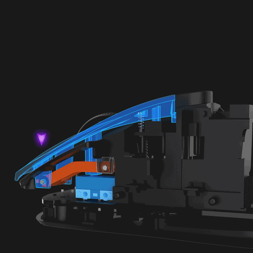 화이트 색상으로 구분되는 기본 좌우 버튼 같은경우에도 단순히 분리 설계만 적용된 것이 아니라 어떤 그립을 하더라도 균일하고 정확한 클릭감을 위해 Key Force Balance System이라는 KBS 2.0 기술설계가 적용되었습니다. 그리고 기본 좌우 버튼 가운데 배치된 휠-버튼 역시 스크롤 정확성과 접지력을 위해 고무 재질에 돌기형 디자인을 적용했으며, 바로 뒤에 배치된 DPI 버튼은 유광처리가 적용되었습니다. 또한, 마우스 전면에는 유선 사용 시 USB 전원 케이블과 연결되는 USB Type-C 포트가 적용되어 있습니다.