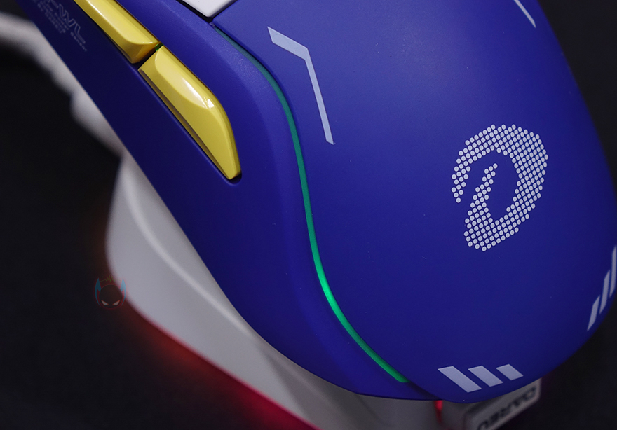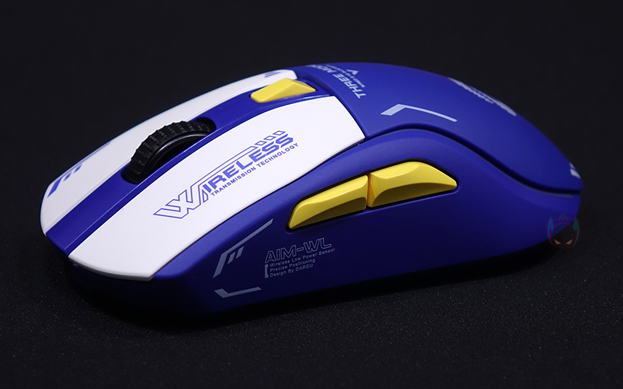 손바닥과 맞닿는 팜-레스트 부분에는 다얼유 로고를 새겨놨으며, 양쪽 경계선처럼 구분되는 곡선라인은 뒤에서 확인하겠지만 RGB 조명 효과를 볼 수 있습니다. 그리고, 왼쪽 측면에도 추가 버튼 2개가 적용되어 있는데, DPI버튼과 마찬가지로 유광처리가 적용되어 있죠. 버튼 앞쪽에는 AIM-WL 센서 문구도 새겨놨습니다.