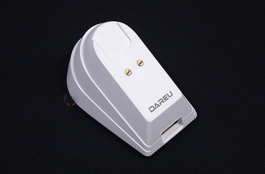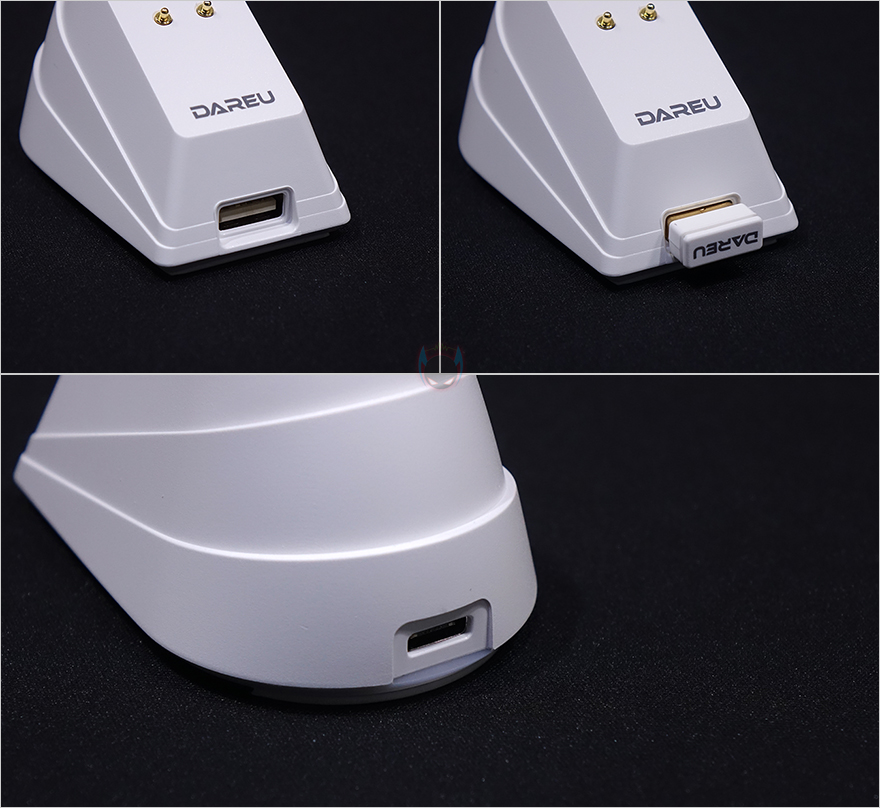 직접, 다얼유 A950 게이밍 마우스를 사용해보면, 일단 전용 충전독에 마우스가 올려져있는 상태는 마치 비행기가 이륙하는 듯한 혹은 경쟁사 L사의 충전독 형태와 유사합니다. 그리고, 충전 중일 때 팜-레스트 테두리 라인의 RGB 조명은 배터리 상태로 점등되며, 충전독에서 분리되면 자동으로 RGB 조명 모드로 작동합니다. 또한, 앞서 언급한 대로 전용 충전독 역시 바닥 테두리 부분에 RGB 조명 효과를 갖추고 있는데, 바닥에 있는 버튼을 누르면, Off를 포함해 총 5가지 모드로 전환할 수 있죠.