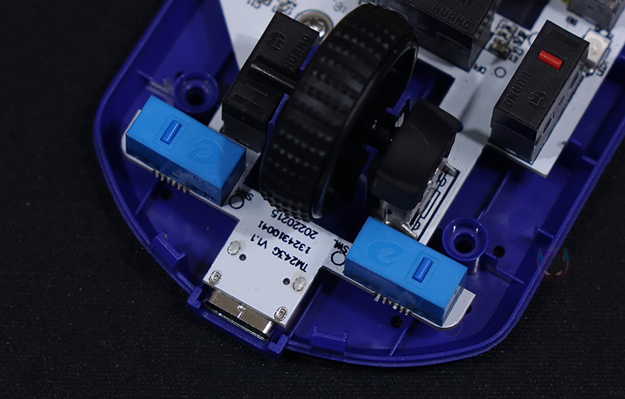 다얼유 A950 게이밍 마우스의 내부를 잠깐 살펴보면, 앞서 잠깐 언급했던 균일한 클릭감을 위해 적용한 KBS 2.0 기술에는 기본 좌우버튼의 내부 스위치 뎀버 부분을 ㅁ자로 형태로 한 부분도 기술의 뒷받침이 된다 할 수 있으며, 기본 좌우 버튼스위치의 경우 다얼유 로고가 새겨져 있어서 자체 개발 스위치인 것으로 짐작할 수 있으며, 나머지 휠-버튼과 DPI, 측면 버튼들은 모두 후아노(HUANO) 스위치를 사용했습니다. 그리고, 센서와 배터리 주변 PCB부분에 RGB 조명 효과를 위해 LED칩이 박혀있는 것을 확인할 수 있습니다.