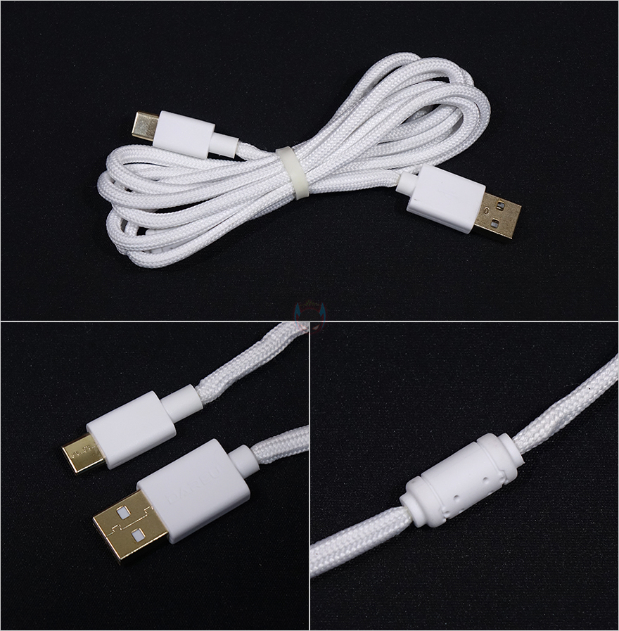 끝으로, 전용 충전독을 살펴보면, 경사 모양을 가졌으며 상단에 마우스와 접촉되는 접지가 있고, 로고 아래의 전면에는 무선 2.4GHz 동글이를 꽂아놓을 수 있는 USB Typa-A 포트가 적용되어 있습니다. 그리고, 반대쪽에는 USB 전원 케이블과 연결되는 Type-C 포트가 적용되어 있죠. 충전독 바닥 부분에는 뒤에서 확인하겠지만, 라운딩 부분으로 RGB 조명 효과를 볼 수 있으며, 가운데 RGB 조명 모드 전환 버튼이 배치되어 있습니다. 그리고, 역시 피트가 기본 부착되어 있는데, 역시 개봉 시에는 보호필름이 부착되어 있죠. USB 전원 케이블 같은 경우에는 약 1.6m 길이에 전체 슬리빙 처리가 된 꼬임 방지의 파라코드 케이블이며, USB Type-C to A 인터페이스를 갖추고 있는데, 모두 신호 손실 최소화를 위해 금-도금 처리되어 있으며, 노이즈 필터도 케이블 한쪽에 적용되어 있습니다.