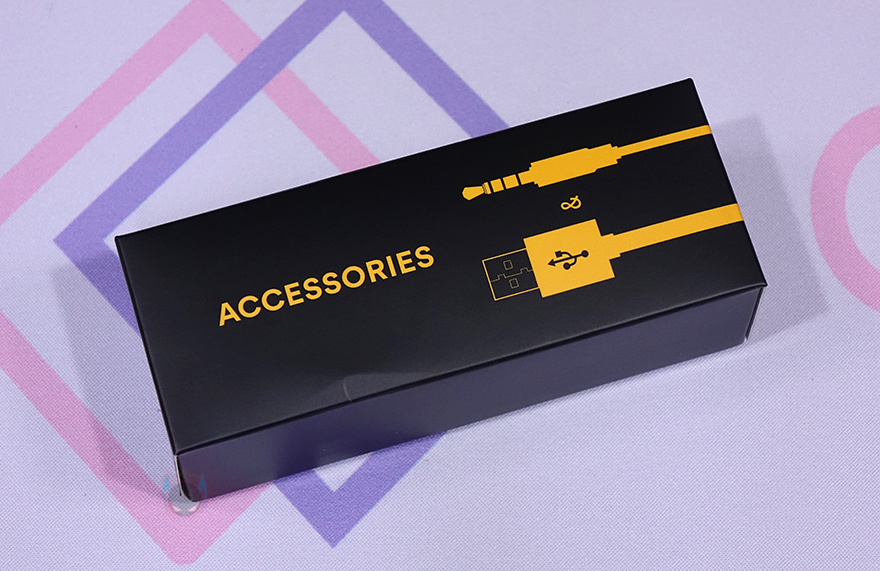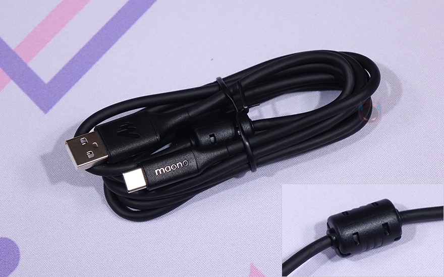 이 밖에 본체 측면에서 보면, 키보드처럼 편하게 사용할 수 있게 경사진 높이를 갖추고 있으며, 맡바닥부분에는 모서리 부근에 미끄럼 방지를 위해 고무 패드가 부착되어 있습니다. 끝으로, 오디오 케이블은 3.5mm TRRS 케이블로 2개 제공해주고 있으며, 길이는 약 80cm이고, PC와 모바일 기기에 연결할 때 사용되는 USB 케이블은 약 1.8m 길이에 USB Type-C to A 인터페이스로 노이즈 필터도 함께 적용되어 있습니다.