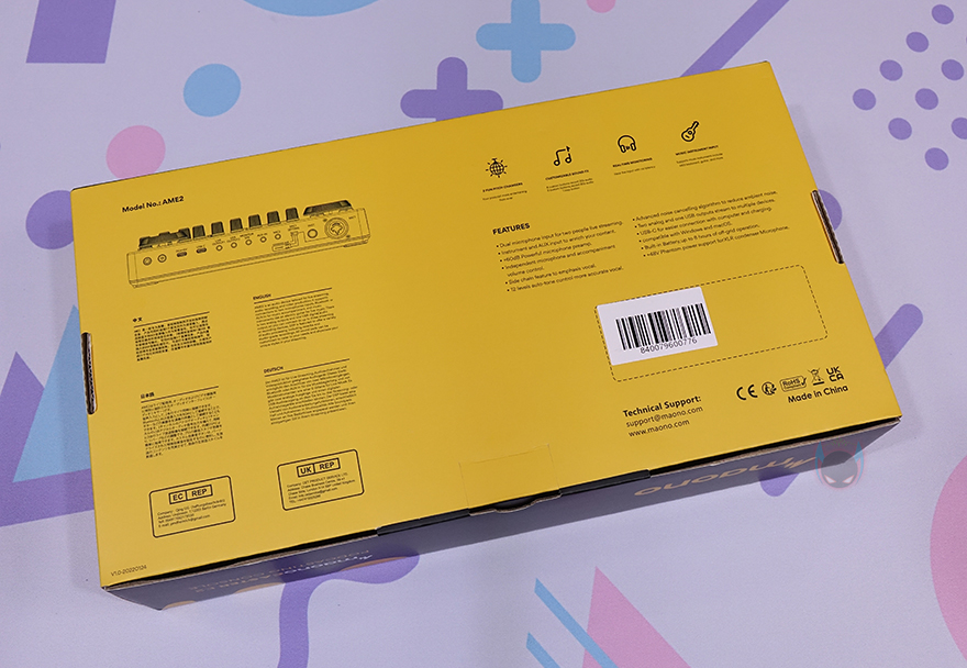 제품 패키지부터 살펴보면, 박스 포장으로 전면에는 제품 이미지를 담고 있어서 어떤 디자인의 오디오 인터페이스인지를 간접적으로 확인할 수 있으며, 모델명과 함께 이 제품의 주요 특징으로 커스텀 사운드 패드(Customized sound pads), 최대 60dB 마이크 감도, 팬텀 파워, 디지털 출력 지원 등을 표기해놨습니다. 물론, 가성비 오디오 인터페이스 제품이라고 언급했는데, 이 정도만 특징으로 언급하면 안 되겠죠. 그래서, 박스 측면에 보면 XLR 마이크 지원부터 악기, 배터리, 2인 마이크, 12단계 오토튠, 실시간 모니터링, 고급 오디오 칩셋, 노이즈 캔슬링 등 총 11가지를 추가로 표기해놨습니다.