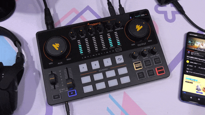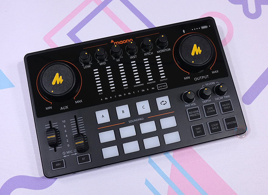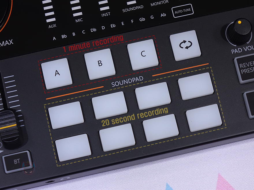 아래쪽 인터페이스에는 가운데 부분에 사운드 패드(Sound Pad)로 위쪽에 배치된 A/B/C 패드는 1분 녹음할 수 있으며, 아래쪽에 8개의 패드는 커스텀 패드(Custom pad)로 20초 녹음할 수 있습니다. 그리고, A/B/C 패드 오른쪽에는 A/B/C 패드에 녹음한 사운드를 반복 재생 On/Off 할 수 있는 버튼이 배치되어 있죠. 그리고, 패드 기준으로 왼쪽에는 마이크 1, 마이크 2의 게인(Gain) 조절 믹서가 있으며, 아래에는 콘덴서 마이크 사용 시 48V 팬텀 파워 On/Off 버튼, 블루투스(Bluetooth) On/Off 버튼이 배치되어 있습니다. 또한, 사운드 패드 기준으로 왼쪽에는 패드 볼륨을 조절할 수 있는 PAD VOL 노브(Knob)를 비롯해, 마이크 에코 효과라 할 수 있는 REVERB의 DEPTH와 DECAY TIME 노브가 있으며, 그 아래에는 REVERB PRESETS, SIDE CHAIN, MUSIC ONLY, DRY WET, LOOP BACK, DENOISE 버튼이 배치되어 있습니다. 이 기능 들은 뒤에서 다시 한번 언급하죠.