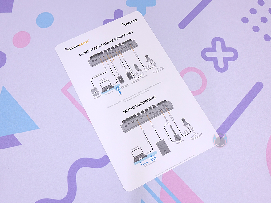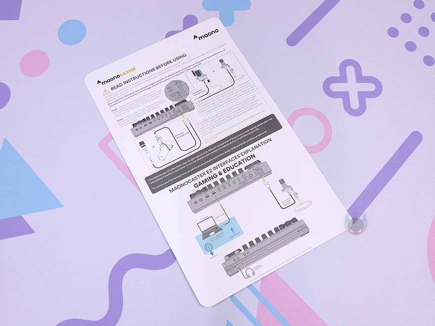 물론, 박스 후면에도 본 제품의 외부 연결 인터페이스 지원 표기와 함께 MAONOCASTER E2 소개 문구, 역시 주요 특징을 다시 한 번 표기한 것을 확인할 수 있으며, 박스를 열어보면, 포장은 외부 충격방지를 위해 스펀지보다 완충이 좋은 우레탄-폼을 사용했으며, 부속품들은 분실이 되지 않게 별도의 박스 포장을 했습니다. 제품 구성은 MAONOCASTER E2 오디오 인터페이스, USB 케이블, 오디오 케이블 2개, 제품설명서, 퀵 가이드로 이루어져 있는데, 퀵 가이드는 외부 연결을 종이 한 장에 쉽게 알아볼 수 있게 담고 있습니다. 참고로, 개봉 시 MAONOCASTER E2 오디오 인터페이스 윗부분 노브쪽에는 보호 필름도 부착되어 있습니다.