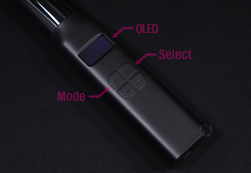 손잡이 부분에는 VL110과 마찬가지로 작동상태를 쉽게 확인할 수 있게 OLED 디스플레이를 적용하고 있으며, 그 아래에는 조작 버튼이 배치되어 있는데, 뒤에서 확인하겠지만, 사용법은 VL110과 동일합니다. M은 모드 전환 버튼이고, 그 옆에 화살표 버튼은 설정 선택, 아래 +/- 버튼은 값을 조절할 수 있죠. 그리고, 오른쪽 측면에는 전원 스위치와 함께 윗부분에 충전 케이블과 연결되는 USB Type-C 포트가 적용되어 있습니다. 그리고, 뒤쪽에는 줄고리를 할 수 있게 홀 처리가 적용되어 있으며, 손잡이 밑바닥 부분에는 삼각대와 연결할 수 있게 1/4인치 나사홀이 적용되어 있죠. 반대로 스틱 쪽 맨 상단에는 제품의 기본 사양 표기를 해놨습니다.