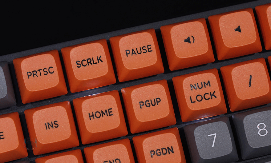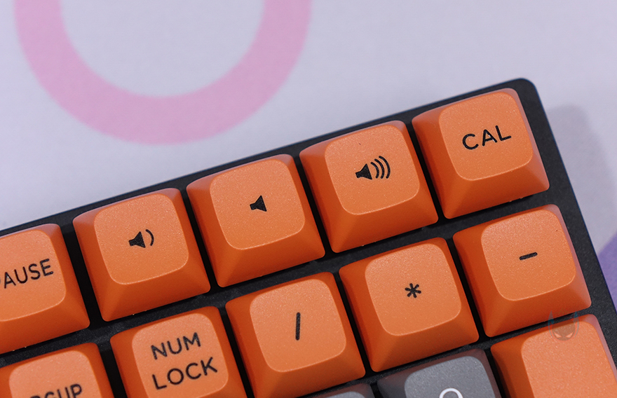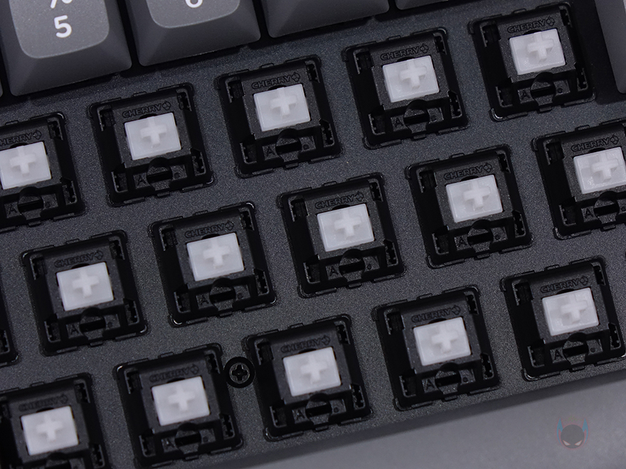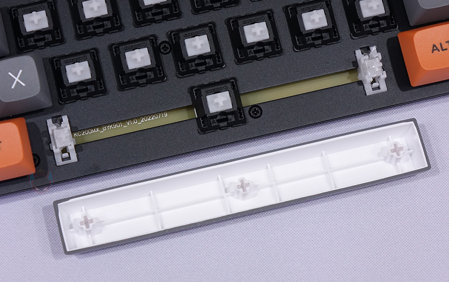 여기에 총 키수도 108 키를 가져 일반적인 104 키 풀-배열보다 4개의 키가 추가되었는데, 4개의 키는 숫자-키패드 위에 배치되어 있죠. 기능은 볼륨 조절과 음소거, 윈도우 운영체제의 계산기 프로그램 실행입니다. 그리고, 키캡은 앞서 확인했듯이 투톤 컬러로 적용되었으며, PBT 이중사출 방식이죠. 스위치 같은 경우에는 변형 백축이라고 부르는 Ergo Clear 스위치로 체리 백축 스위치의 스프링을 흑축 스위치의 스프링으로 교체한 스위치입니다. 또한, 스프링만 교체한 게 아니라 윤활처리까지 모두 적용되었죠. 그래서, 키압은 갈축 느낌을 주면서 소음은 적축에 가까운 특징을 가졌습니다. 여기에 스위치 방향도 체리 문구가 정방향으로 보이게 장착되었죠. 스테빌라이저는 당연히 체리식입니다.