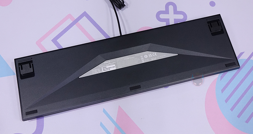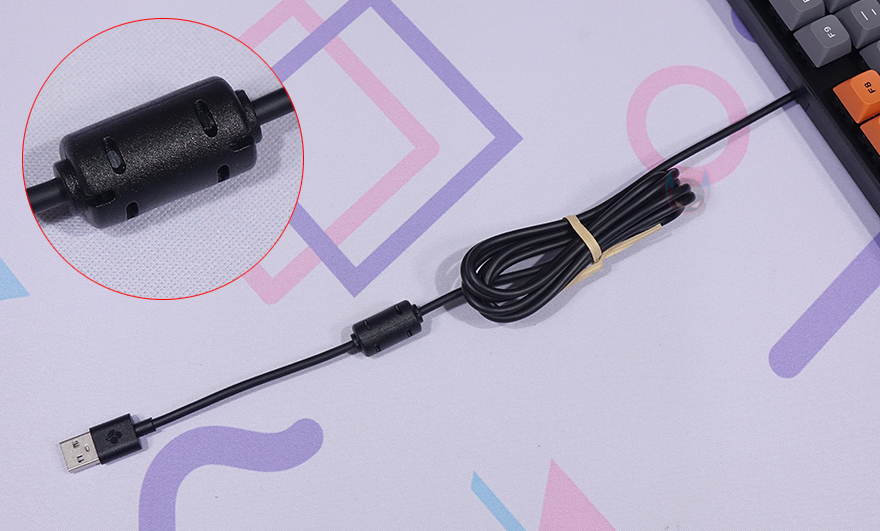 키보드 측면에서 보면 타이핑에 최적화라 불리우는 스텝-스컬처 2 단계배열을 갖추고 있는데, 바로 뒤에서 확인하겠지만, 키보드 밑바닥에 높낮이 조절 받침대가 적용되어 있어서 타이핑 각도조절을 할 수 있습니다. 그리고, 키보드 밑바닥 부분에는 아랫부분에 미끄럼 방지 고무패드를 부착해 놨으며, 윗부분에 배치된 높낮이 조절 받침대에도 패드가 부착되어 있습니다. 끝으로, 전원케이블은 USB 인터페이스에 신호손실 최소화를 위해 노이즈필터도 적용되어 있죠.