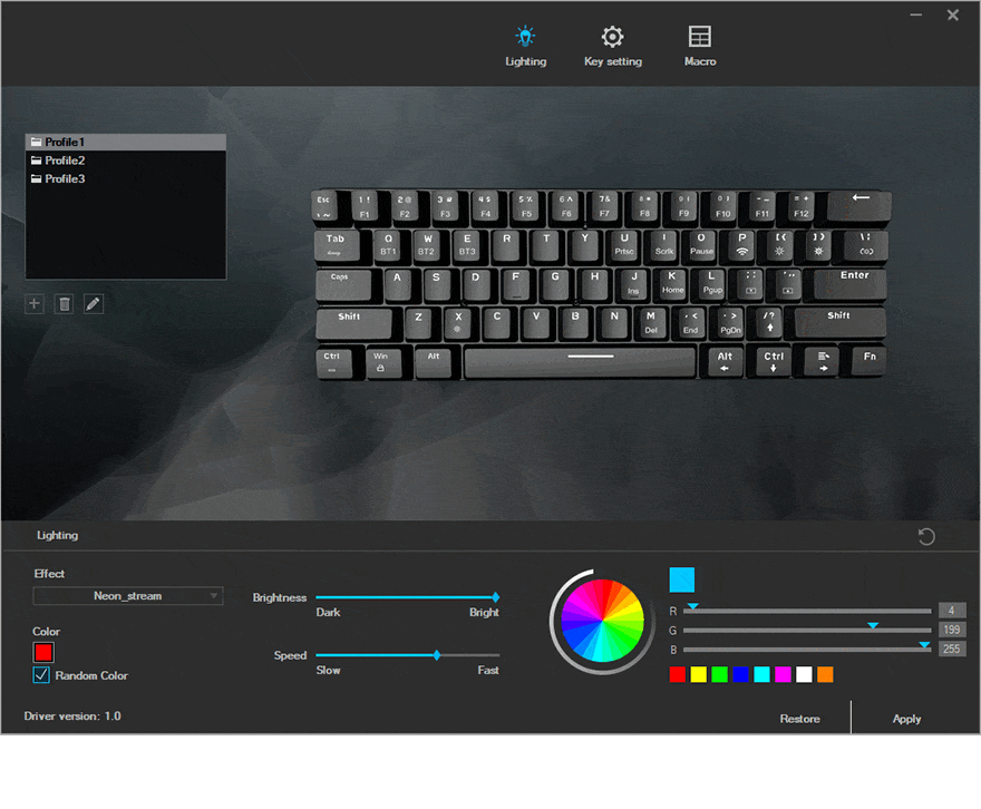 Blitzwolf BW-KB0 키보드 역시 전용 소프트웨어를 제공해주고 있기때문에 사용자가 사용환경에 맞춰 설정할 수 있는데, 구글 드라이브에서 다운로드 받을 수 있으며, 설치 후 프로그램을 실행해 보면, 메뉴는 크게 3가지로 조명, 키 설정, 매크로입니다. 조명 설정에는 앞서 확인한 RGB 모드를 프로그램에서도 전환할 수 있으며, 밝기와 속도, 색상 변경도 가능합니다. 그리고, 키 설정은 사용자가 선택한 키를 원하는 기능으로 변경할 수 있는데, 멀티미디어 핫-키, 매크로 키 설정도 가능합니다.