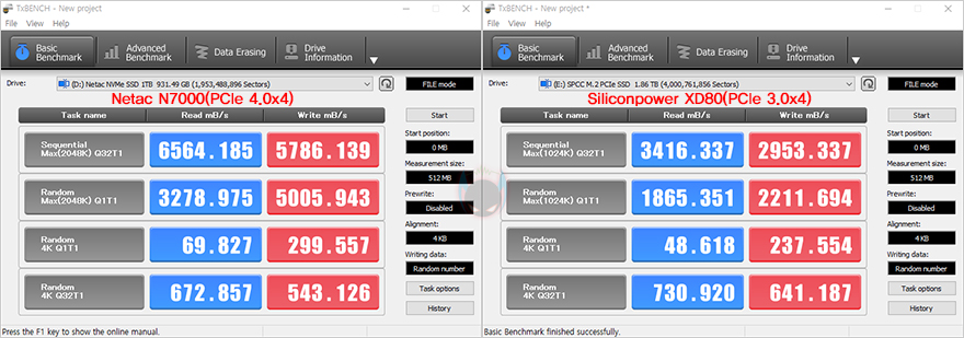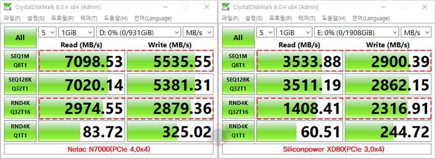그럼, 이제 Netac N700 NVMe SSD의 성능을 확인해봐야겠죠. 일단, NV7000 모델 같은 경우 1TB, 2TB, 4TB 용량으로 출시가 되었는데, 리뷰에 사용된 용량은 1TB 모델이며, 비교대상으로는 이전 세대인 PCIe 3.0x4 규격의 NVMe SSD로 선택했습니다. 먼저, SSD 제품사양표기에 속도표시 기준으로 많이 사용되는 CrystalDiskMark로 속도 성능을 비교해 보면, 두 제품 모두 지원하는 규격속도에 근접하는 속도를 보여줬으며, PCIe 4.0x4 규격인 NV7000 같은 경우는 1TB 모델에서 보여줄 수 있는 스펙사양의 속도 읽기 7200MB/s와 쓰기 5500MB/s 속도에 거의 근접하게 작동했습니다. 물론, PCIe 3.0x4 SSD보다 빠른 속도를 보여주고, 실제 속도체감이라 할 수 있는 랜덤 4K에서도 앞서는 속도를 보여주죠.