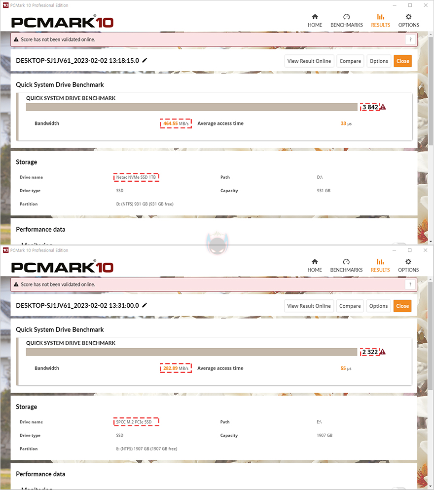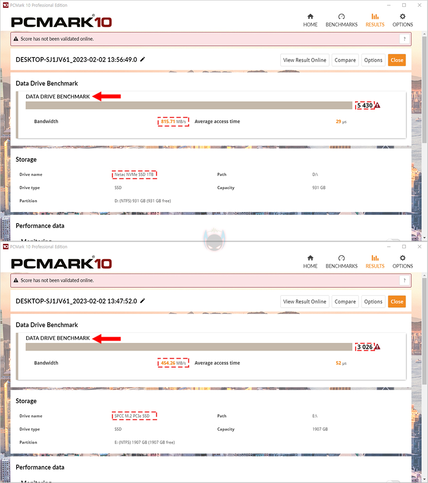 끝으로, 시스템 벤치마크로 유명한 PCMark 10과 3DMark로도 저장장치 성능과 속도 비교를 해봤는데, 성능 점수에서나 대역폭 속도 비교에서도 모두 PCIe 4.0x4 규격의 NV7000이 PCIe 3.0x4 SSD의 성능을 앞서는 결과를 보여줬습니다. 특히, 대역폭에서도 2배 가까이 차이가 나기때문에, 실제 프로그램 작업이나 게임 로딩 시 체감차이가 충분히 있을 수 있습니다.