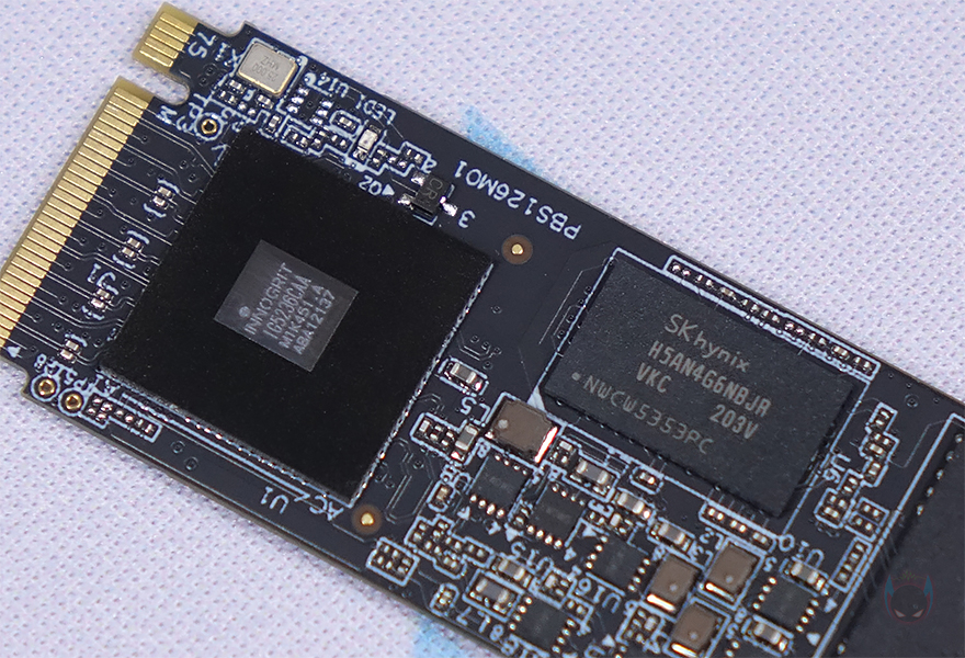 상판과 하판 방열판을 결합해주는 측면 나사를 풀면 방열판을 분리할 수 있는데, 분리해서 살펴보면, 상하 방열판 안쪽에 모두 발열해결을 위해 써멀패드(Thermal-Pad)가 기본 부착되어 있습니다. 그리고, PCB 기판을 살펴보면, 앞뒤로 낸드플래시가 적용되어 있고, DRAM도 적용되어 있는 것을 확인할 수 있죠. 물론, 컨트롤러 칩셋도 확인할 수 있는데, 컨트롤러 칩셋은 INNOGRIT사의 IG5236으로 PCIe 4.0x4 지원 칩셋입니다. 또한, DRAM 같은 경우에는 SK 하이닉스(Hynix) DDR4 2666MHz 4GB(256Mx16) 용량이 되겠습니다.