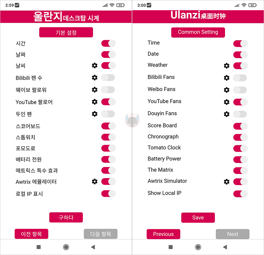 일반설정이 끝나면, 다음항목(Next)을 누릅니다. 그럼, 이제 전면 디스플레이에서 보여줄 기능들을 On/Off하는 공통설정(Common Setting)이 나오는데, 시간/날짜/날씨/Bilibili 구독자수/Weibo 팔로워/유튜브 구독자수/Douyin 팔로워/스코어보드/포모도로 타이머/배터리 잔량/매트릭스 효과/Awtrix 시뮬레이터, 로컬 IP표시 기능입니다. 사실 이런 TC001 Smart Pixel Clock 같은 제품들의 원조는 Awtrix죠. Awtrix 시뮬레이터를 통해서 픽셀화면을 보여주는 제품들은 꽤 많습니다. 다만, TC001 Smart Pixel Clock의 기능들이 Awtrix 시뮬레이터와 비슷하기 때문에, Awtrix 시뮬레이터를 잘 다루지 못하는 소비자들은 TC001 Smart Pixel Clock에서 지원하는 기능들만 사용해도 충분하죠. 참고로 On/Off 스위치 옆에 톱니바퀴 모양은 해당 기능의 설정으로 날씨나 유튜브 같은 연동 연결 시 사용하면 됩니다. 다만, 날씨 같은 경우에는 중국 지역을 제외한 다른 나라 날씨는 아직 제대로 반영이 되지 않습니다. 참고로, 배터리 잔량은 70% 이상이면 그린(Green), 75~25%면 옐로우(Yellow), 29% 미만이면 레드(Red)로 표기되며, 앞서 확인했듯이 내장배터리용량은 4,000mAh입니다.
