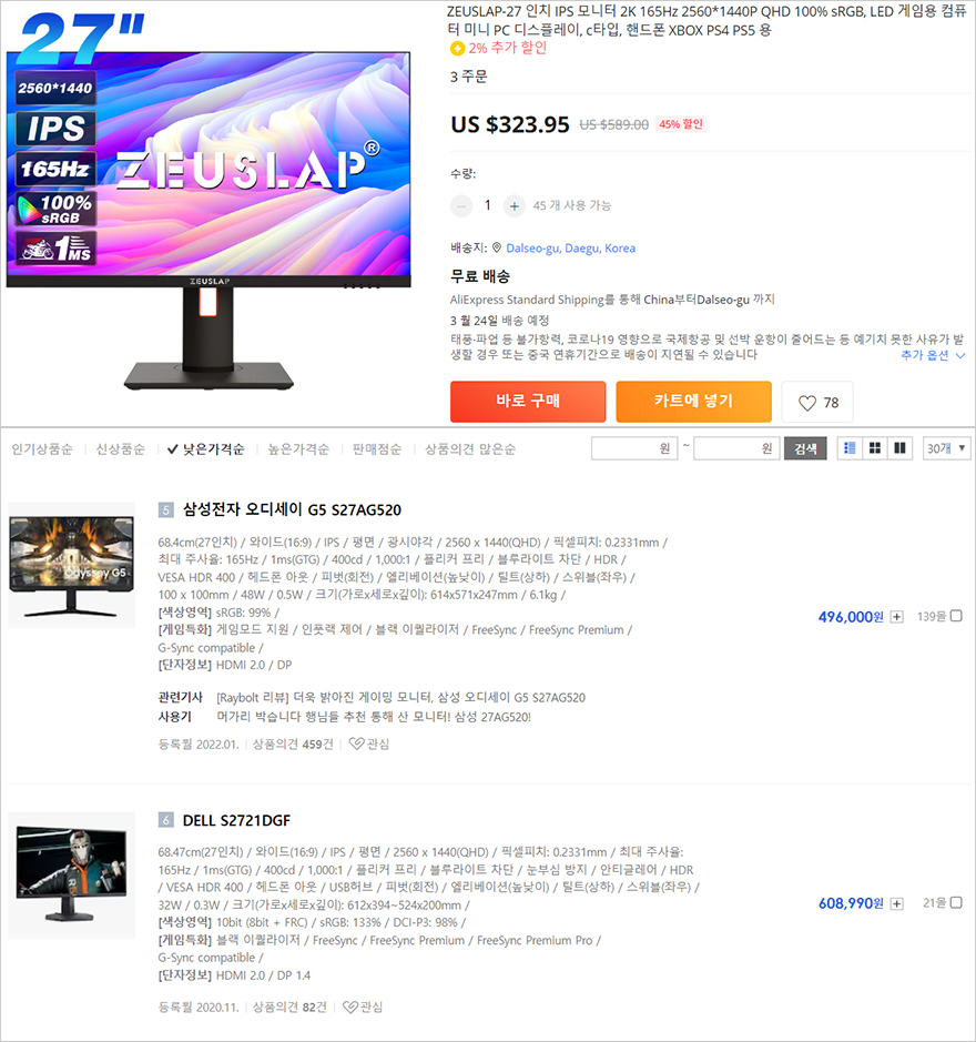 끝으로, 이번에 출시한 제우스랩 27인치 게이밍 모니터를 국내 판매 중인 27인치 모니터에 QHD 해상도, 165Hz 화면주사율, HDR 400 주요 사양과 동일한 제품들로 가격 비교를 해보면, 제우스랩 제품은 한화로 약 43만원대이고, 한국에서 비슷한 제품의 가장 저렴한 가격대가 50만원에 근접합니다. 여기에 썬더볼트 겸용 USB Type-C와 USB 허브까지 갖춘 제품으로 비교하면 가장 저렴한 가격대가 60만원대입니다. 한눈에 봐도 제우스랩 27인치 게이밍 모니터가 가성비라는 걸 쉽게 알 수 있죠. 특히, 제우스랩 공식 스토어가 알리익스프레스이기 때문에, 알리익스프레스 할인행사 때 구매하게 되면 30만원대로 진입하니깐 할인 때 구매하면 더 가성비 만족을 느낄 수 있습니다.