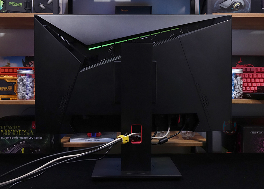 모니터 측면을 보면 게이밍 모니터에서 많이 볼 수 있는 후면이 볼록한 형태이며, 후면을 살펴보면, V자형의 유광처리된 부분은 뒤에서 확인하겠지만, RGB 조명효과가 적용되어 있습니다. 또한, 후면 양쪽 아래쪽에는 2W 출력의 내장 스피커도 적용되어 있죠. 그리고, 모니터 출력 및 전원 등의 포트는 스탠드 기준 후면에서 봤을 때 오른쪽에 배치되어 있는데, 모니터 출력포트는 HDMI, DP 포트로 갖추고 있으며, 그 옆으로 썬더볼트 겸용 지원의 USB Type-C 포트, USB 허브 지원의 USB Type-B, USB Type-A 포트 2개, 스피커 및 헤드셋 연결의 오디오 포트, 전원 포트순으로 배치되어 있습니다.