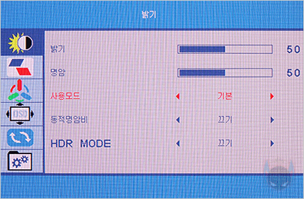 이번엔 모니터의 OSD 메뉴를 살펴보는데, 메뉴는 크게 6가지로 분류되며, OSD 언어에 한국어도 포함되어 있습니다. 또한, OSD 메뉴를 위치이동 할 수 있으며, 앞서 확인한 모니터 후면의 RGB 조명효과 역시 LED EFFECT 메뉴에서 On/Off 할 수 있죠. 또한, 화면 비율 역시 기본 16:9의 와이드와 4:3 비율로 전환할 수 있습니다. 또한, 화면 모드 같은 경우에는 총 6가지 모드를 제공해주고 있는데, 기본/게임/영화/문서/FPS/RTS 모드 기본과 게임은 동일하며, 나머지 각 모드들은 밝기와 색온도의 차이를 보여줍니다. 또한, HDR 모드 역시 자동으로 적용해 주는 AUTO와 비디오 콘텐츠 HDR에 맞추는 HD 2048 모드도 갖추고 있죠.