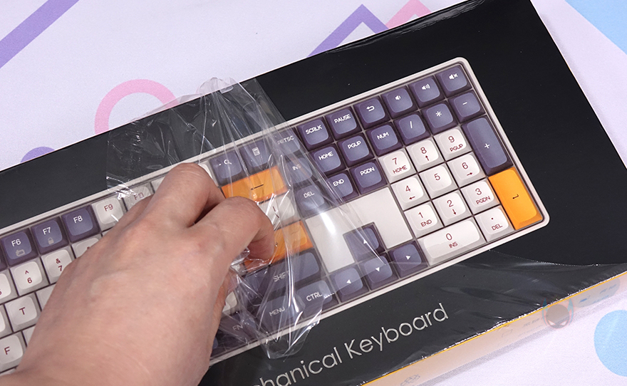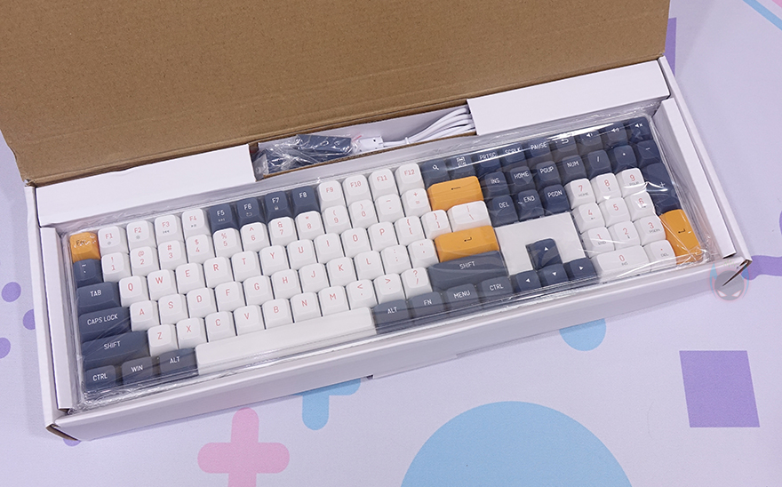 박스를 열어보면, 포장 역시 A100과 동일하게 속박스가 한 번 더 적용된 방식으로 속박스를 열어보면, 비닐 포장된 A108 키보드를 확인할 수 있습니다. 물론, A108에서도 투명 루프가 제공되죠. 그리고, 제품구성은 A108 키보드, 분리형 USB 전원 및 충전케이블, 키캡&스위치 리무버, 여분의 스위치, 교체용 포인트 키캡, 제품 설명서로 이루어져 있습니다. 역시 키보드를 제외하면 A100과 나머지 구성품은 차이가 없죠.