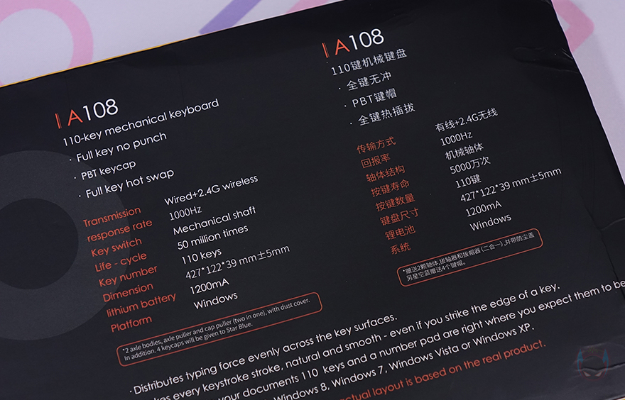 제품 패키지는 먼저 만났던 A100과 마찬가지로 박스형태에 전체 비닐 밀봉까지 처리되어 있죠. 소비자입장에선 판매 제품에 좀 더 신뢰를 가질 수 있는 패키지 처리이기도 합니다. 그리고, 시작에서 잠깐 언급했듯이 A108은 풀-배열 키보드이기때문에 A100과 박스에서부터 크기 차이가 있죠. 또한, 눈치가 빠른 소비자라면 새로운 색상이 추가되었다는 것도 전면 제품 이미지를 통해 바로 짐작할 수 있는데, 측면에 스위치 구분과 함께 색상 구분표기까지 확인할 수 있습니다. 그리고, 박스 후면에는 A100과 동일하게 제품의 기본 사양을 표기해 놨는데, A100가 가장 큰 차이는 배열과 그에 따른 사이즈 차이정도죠.