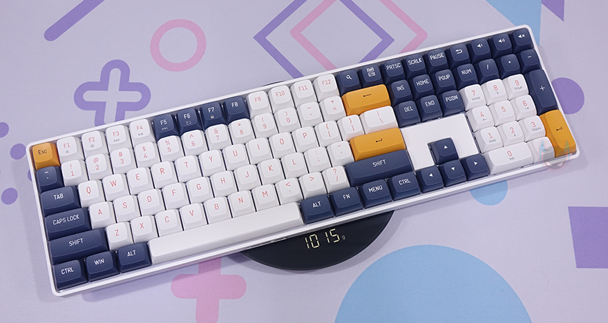 그럼, 본격적으로 Aigo A108 유무선 기계식 키보드를 살펴보는데, 앞서 잠깐 언급했듯이 A108에서 A100과 가장 큰 차이점 하나는 바로 색상이 하나 더 추가되었다라는 점입니다. 기존의 아이보리(wheat yellow) 색상과 블랙오렌지(black orange) 색상 외에 블루계열의 'Starry sky blue' 모델이 추가되었죠. 그리고, 크기는 역시 풀-배열답게 먼저 만났던 A100보다 깁니다. 물론, 무게도 좀 더 나가서 약 1kg대를 가지고 있죠. 또한, A108은 총 110 키를 가지고 있는데, 기본 104 키에서 추가로 6개의 키가 적용된 형태로 6개의 키는 Fn키 조합 없이 바로 독립 실행할 수 있는 키로 F12키 오른쪽에 검색(search)과 계산기(calculator) 키가 배치되어 있으며, 숫자-키패드 위에 뒤로 가기(back), 볼륨조절(volume control), 음소거(mute) 키가 배치되었습니다.