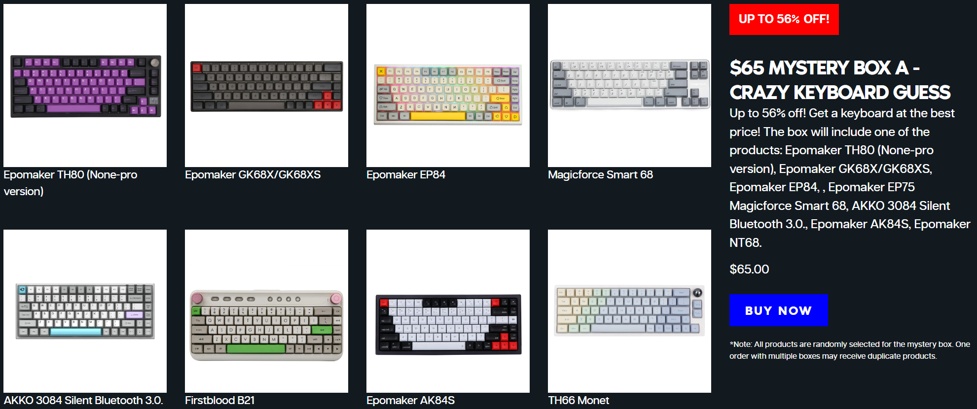 글로벌 키보드 전문샵 EPOMAKER(https://epomaker.com/)는 3월 27일부터 4월 1일까지 최대 56% 할인의 봄맞이 행사를 진행하고 있다. 이번 행사에선 Epomaker에서 인기있었던 상품들을 10% 할인 해주는 혜택과 더불어 최대 56% 할인 혜택을 받을 수 있는 미스터리 박스 이벤트도 진행되고 있다. 미스테리 박스에는 피스커뮤에서도 리뷰했던 EP84 키보드를 비롯해, TH80, GK68X/GK68XS, EP75, AK84S, NT68, Magicforce Smart 68, AKKO 3084 Silent Bluetooth 3.0 등이 키보드들이 포함되어 있어서 랜덤이지만 경우에 따라서 저렴하게 비싼 모델을 받을 수 있다.