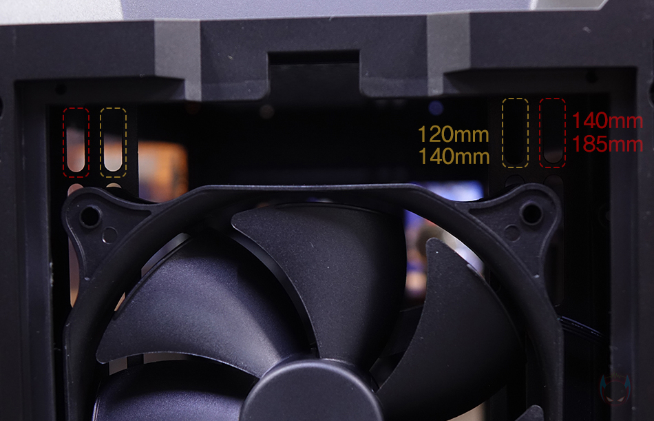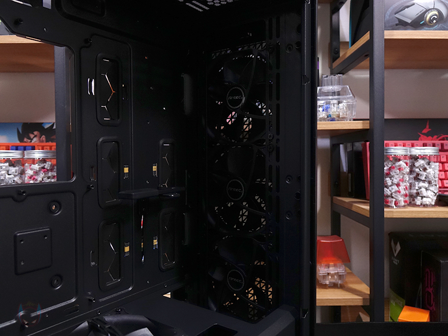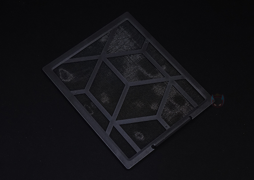 그리고, 전면 패널의 메탈 메쉬 부분은 위에서 앞으로 당기면 쉽게 분리가 되죠. 무나사의 푸쉬-핀 방식입니다. 메탈 메쉬 패널을 분리하면 안쪽에 분리형 먼지필터를 확인할 수 있는데, 역시 걸쇠방식으로 쉽게 분리가 됩니다. 즉, 전체 전면 패널을 분리할 필요 없이 청소와 팬 교체 편의성을 위해 분할식 분리를 적용했습니다. 먼지필터를 분리하면 전면 내부에는 전면쿨링시스템으로 120mm 팬이 기본 3개 장착된 것을 확인할 수 있는데, 맨 위부분에 여백을 통해 좌우로도 추가 나사홀-라인이 있는 것을 확인할 수 있습니다. 그래서, 전면에는 140mm 팬으로도 최대 3개까지 장착이 가능하고, 185mm 팬도 최대 2개까지 장착이 가능하죠. 물론, 수랭쿨러 장착 시 최대 360mm까지 라디에이터 장착도 가능합니다.
