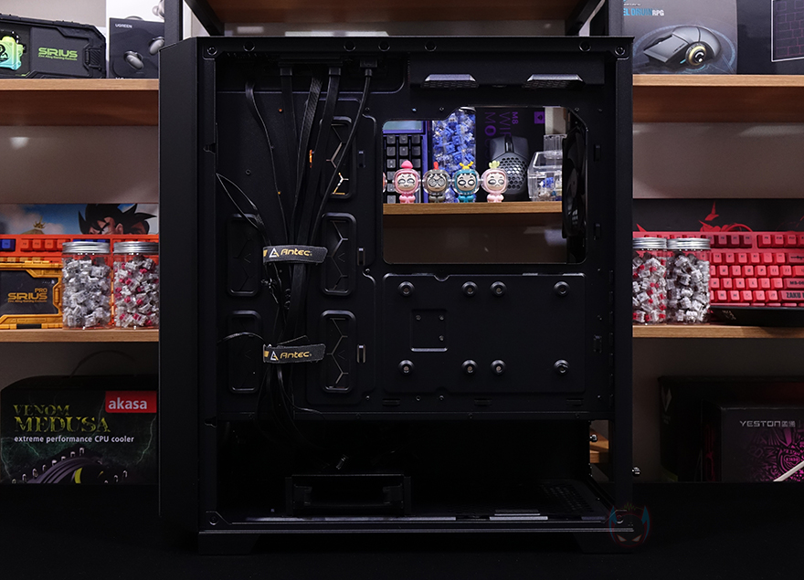 메인보드 트레이를 후면에서 보면, 큼지막한 CPU-cut-out을 비롯해 윗부분에 케이블을 정리할 수 있는 홀과 앞부분에 기본 케이스 패널의 케이블을 벨크로타이로 정리해 놨으며, 주변으로도 케이블 정리를 할 수 있게 홀 처리와 함께 고무 패킹도 적용하고 있습니다. 또한, CPU-cut-out 바로 아래에는 2.5인치 저장장치를 장착할 수 있는데, 제공되는 전용 볼트를 저장장치에 체결한 후 그대로 장착 자리에 끼워주면 됩니다. 장착 자리에 각 홀마다 고무 패킹이 있어서 잘 빠지지 않고, 매우 간단하게 장착할 수 있어서 편리하죠. 또한, 바로 아래에는 역시 케이블을 정리할 수 있게 묶을 수 있는 고리를 적용하고 있습니다.